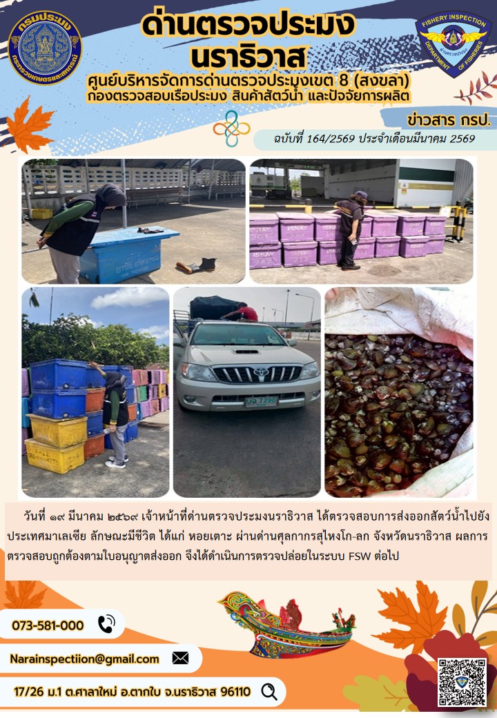 ประชาสัมพันธ์ด่านตรวจประมงนราธิวาส ประจำวันที่ 19 มีนาคม 2569