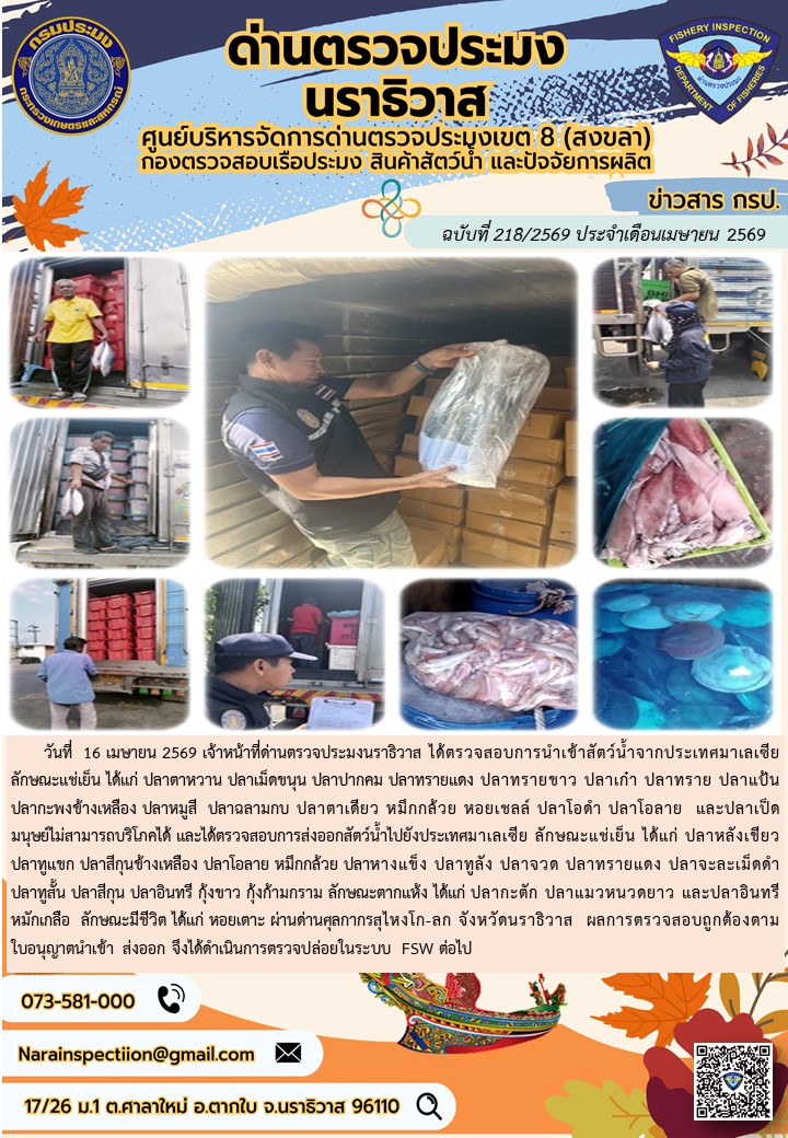 ประชาสัมพันธ์ด่านตรวจประมงนราธิวาส ประจำวันที่ 16 เมษายน 2569