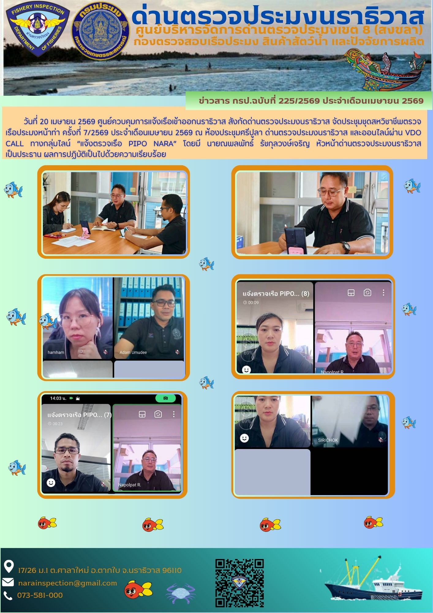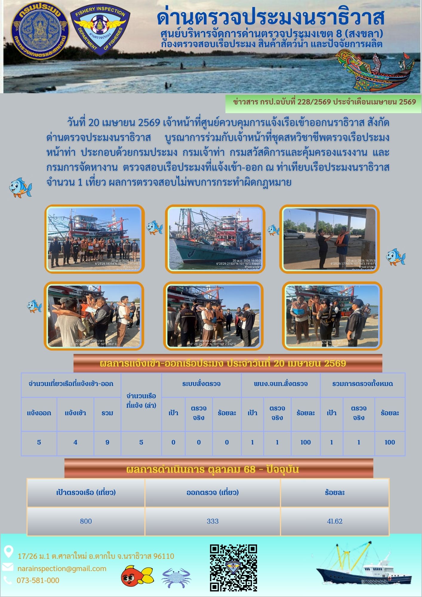 ประชาสัมพันธ์ด่านตรวจประมงนราธิวาส ประจำวันที่ 20 เมษายน 2569