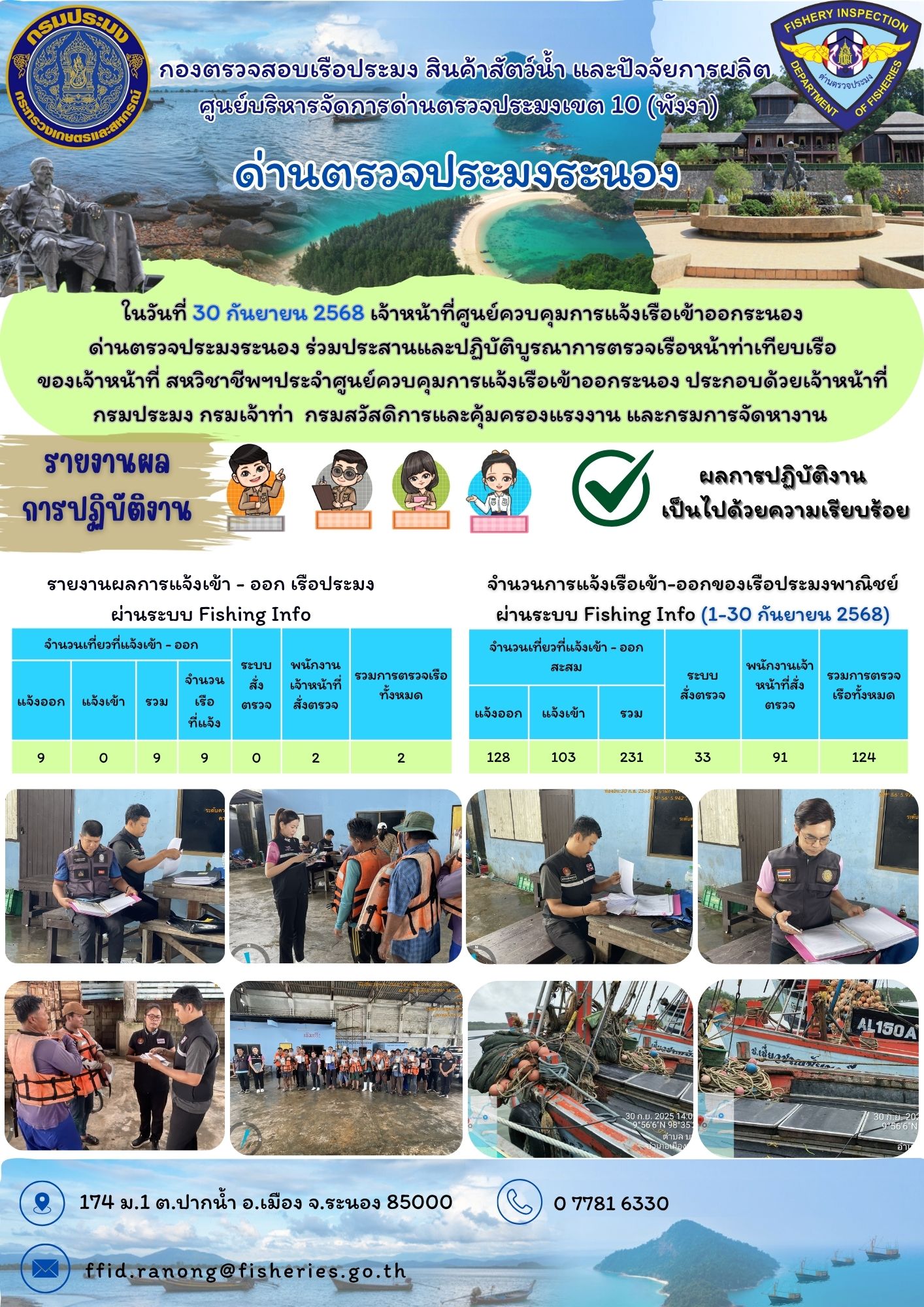 ในวันที่ 30 กันยายน 2568 เจ้าหน้าที่ศูนย์ควบคุมการแจ้งเรือเข้าออกระนอง