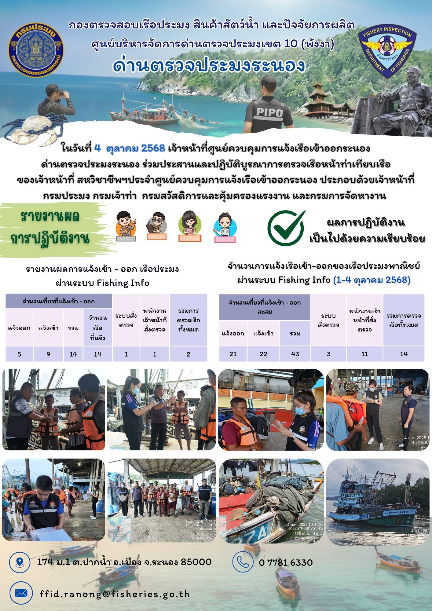 ในวันที่ 4 ตุลาคม 2568 เจ้าหน้าที่ศูนย์ควบคุมการแจ้งเรือเข้าออกระนอง