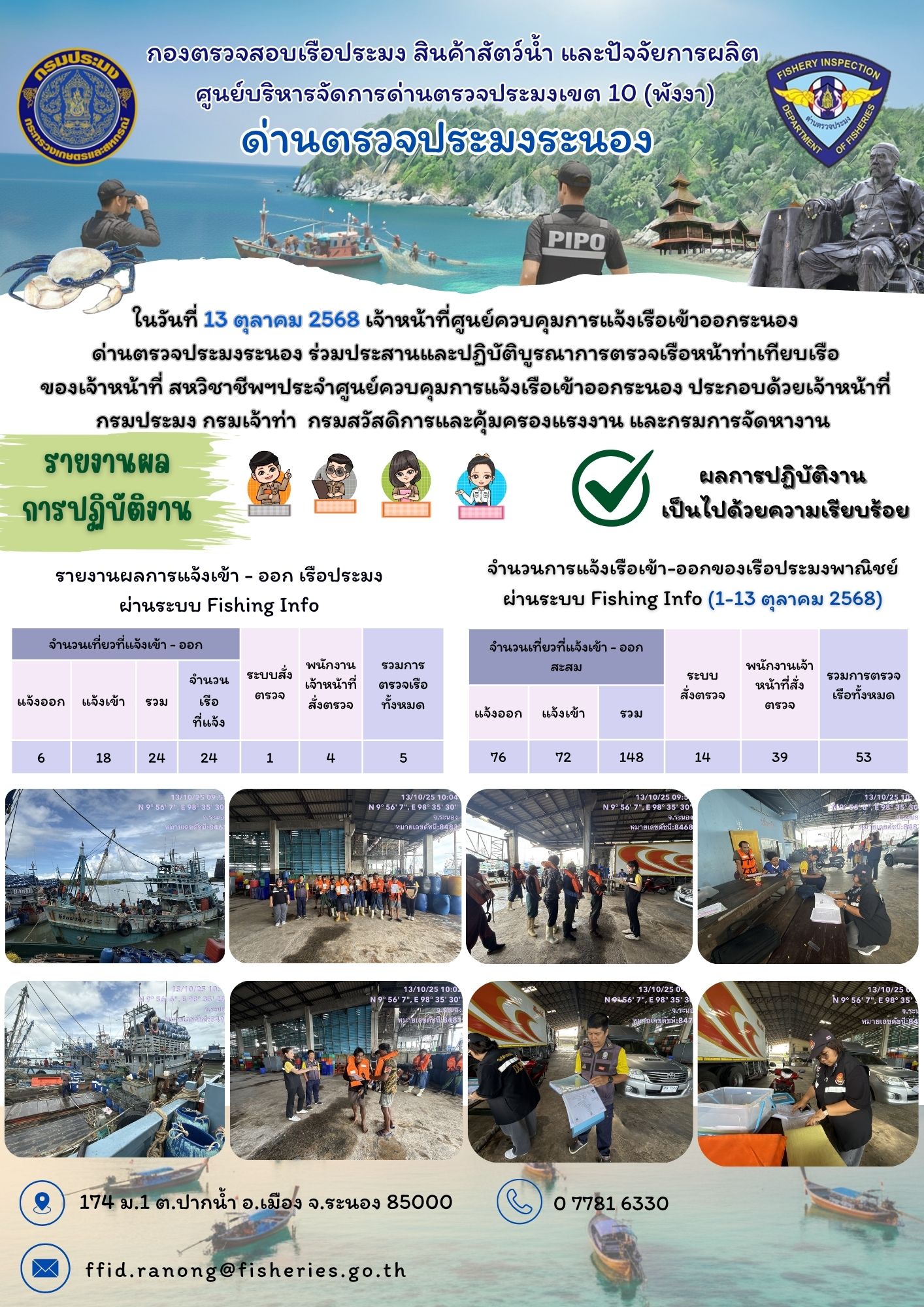 ในวันที่ 13 ตุลาคม 2568 เจ้าหน้าที่ศูนย์ควบคุมการแจ้งเรือเข้าออกระนอง