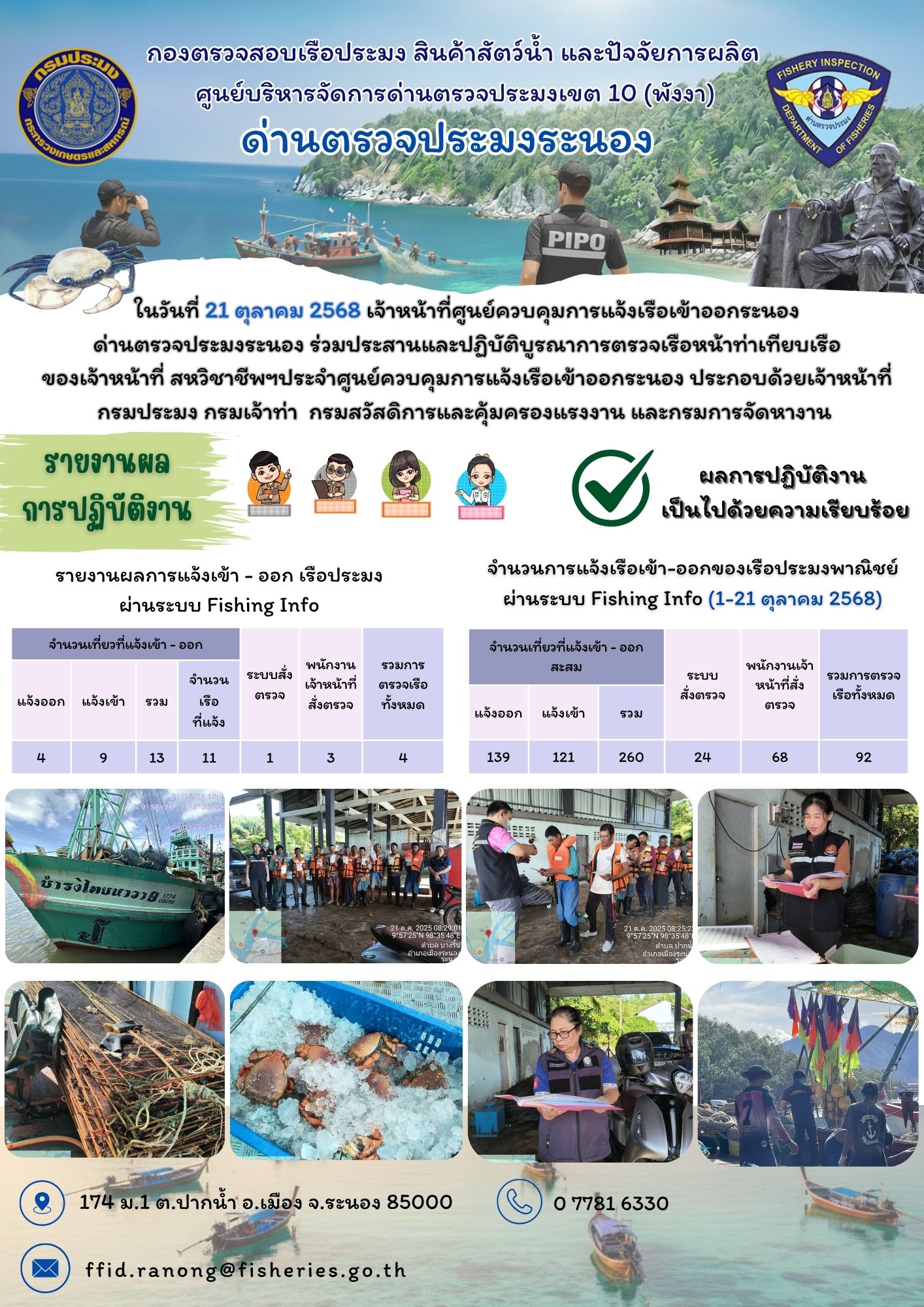 ในวันที่ 21 ตุลาคม 2568 เจ้าหน้าที่ศูนย์ควบคุมการแจ้งเรือเข้าออกระนอง