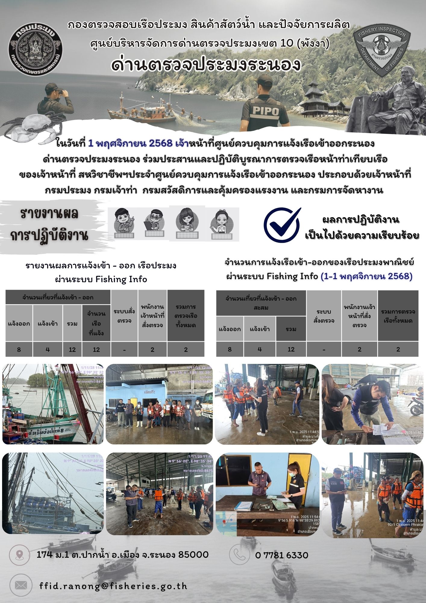 ในวันที่ 1 พฤศจิกายน 2568 เจ้าหน้าที่ศูนย์ควบคุมการแจ้งเรือเข้าออกระนอง