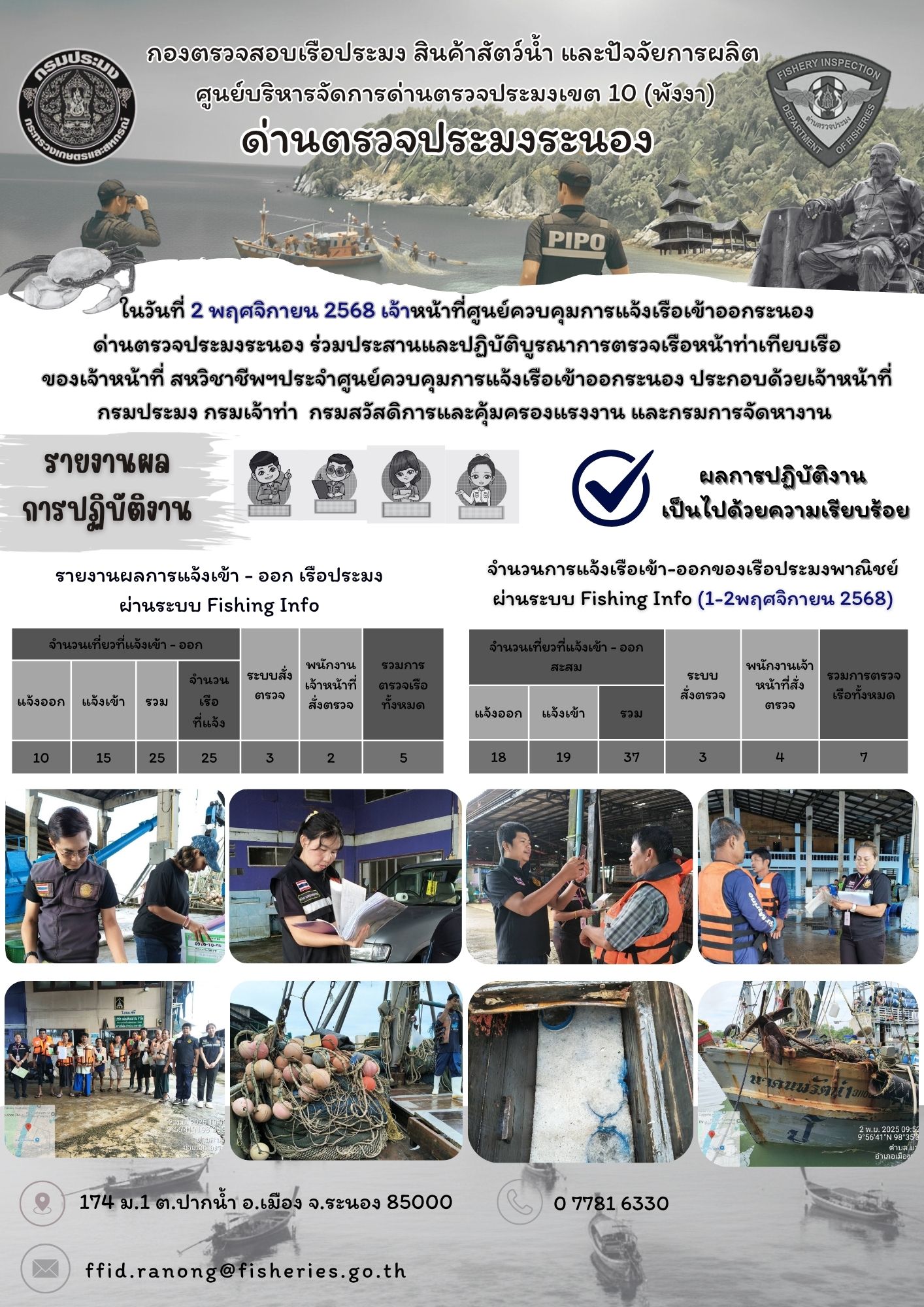 ในวันที่ 2 พฤศจิกายน 2568 เจ้าหน้าที่ศูนย์ควบคุมการแจ้งเรือเข้าออกระนองด่านตรวจประมงระนอง ร่วมประสานและปฏิบัติบูรณาการตรวจเรือหน้าท่าเทียบเรือของเจ้าหน้าที่ สหวิชาชีพฯประจำศูนย์ควบคุมการแจ้งเรือเข้าออกระนอง ประกอบด้วยเจ้าหน้าที่กรมประมง กรมเจ้าท่า กรมสวัสดิการและคุ้มครองแรงงาน และกรมการจัดหางาน ผลการปฏิบัติงานเป็นไปด้วยความเรียบร้อย