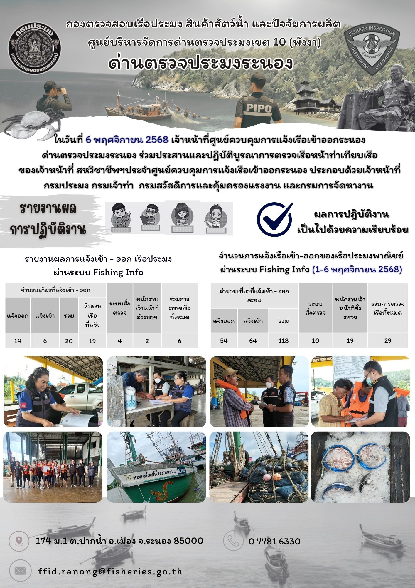 ในวันที่ 6 พฤศจิกายน 2568 เจ้าหน้าที่ศูนย์ควบคุมการแจ้งเรือเข้าออกระนอง