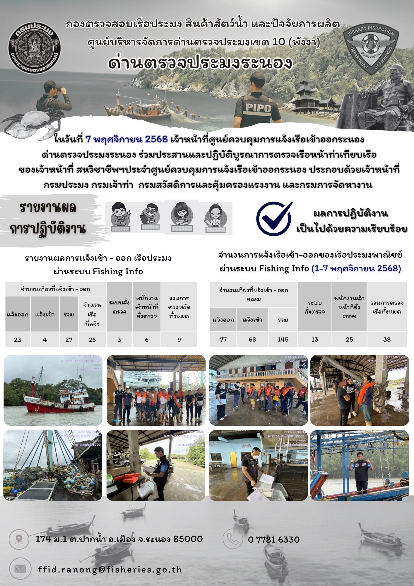 ในวันที่ 7 พฤศจิกายน 2568 เจ้าหน้าที่ศูนย์ควบคุมการแจ้งเรือเข้าออกระนอง
