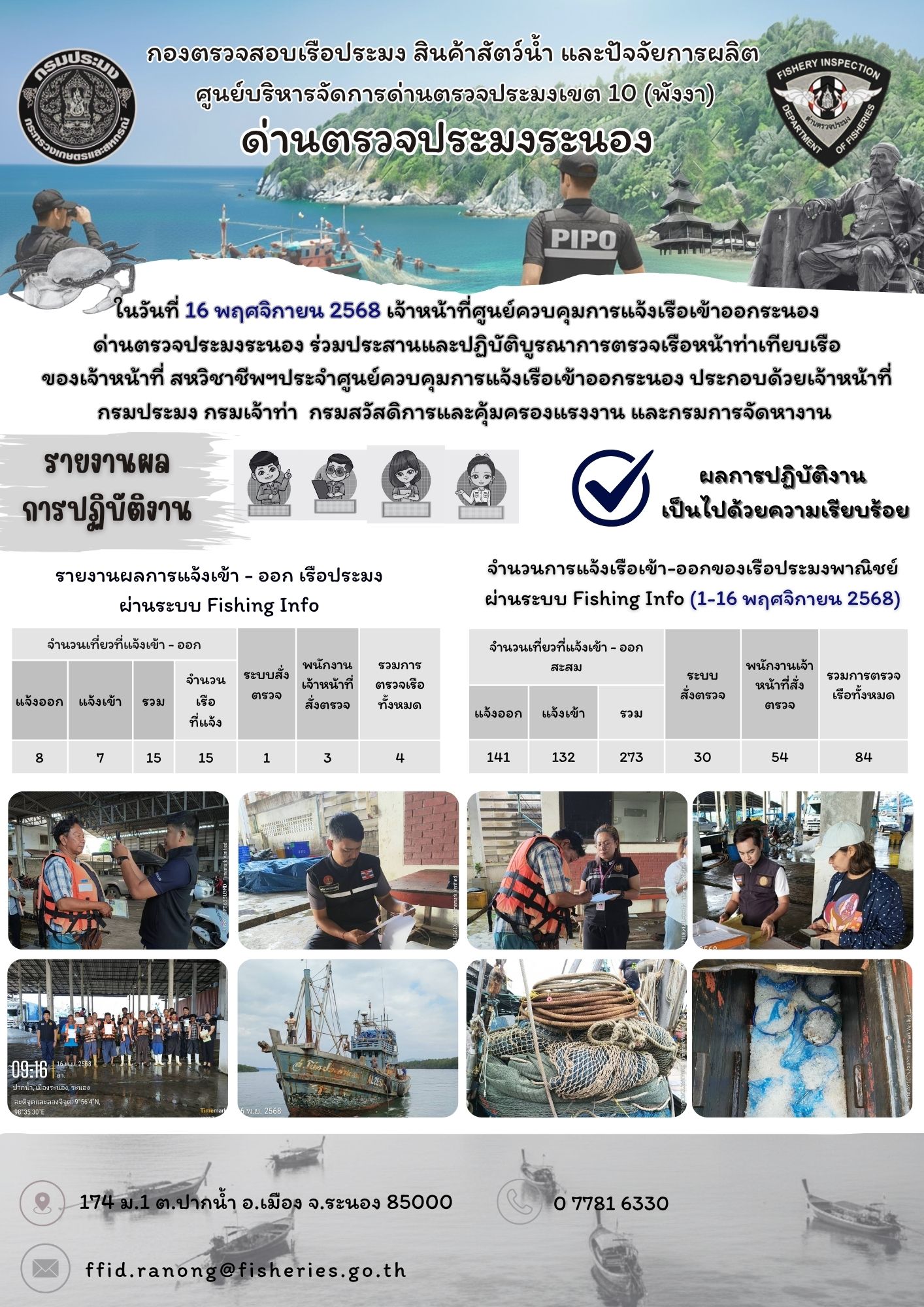 ในวันที่ 16 พฤศจิกายน 2568 เจ้าหน้าที่ศูนย์ควบคุมการแจ้งเรือเข้าออกระนอง