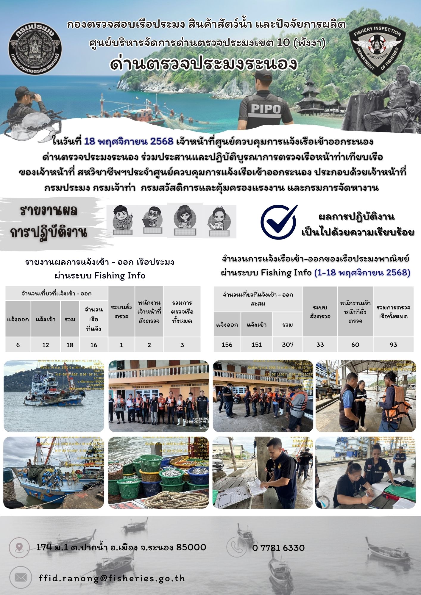 ในวันที่ 18 พฤศจิกายน 2568 เจ้าหน้าที่ศูนย์ควบคุมการแจ้งเรือเข้าออกระนอง