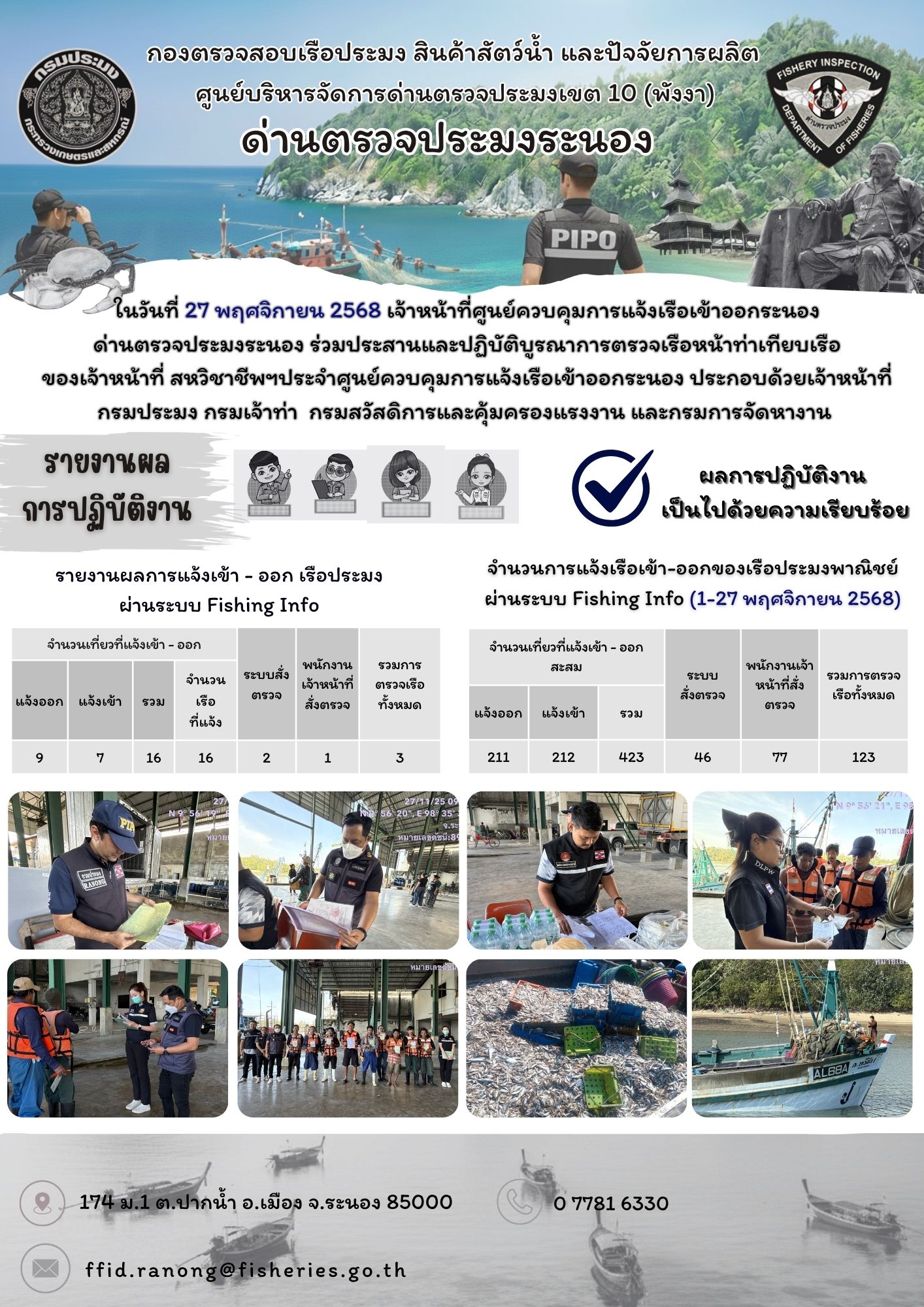 ในวันที่ 27 พฤศจิกายน 2568 เจ้าหน้าที่ศูนย์ควบคุมการแจ้งเรือเข้าออกระนอง