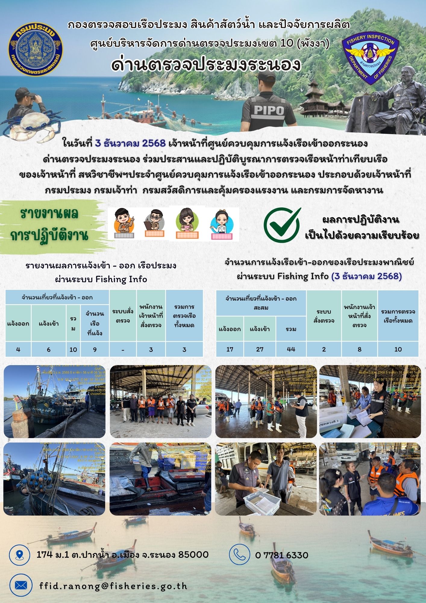 ในวันที่ 3 ธันวาคม 2568 เจ้าหน้าที่ศูนย์ควบคุมการแจ้งเรือเข้าออกระนอง