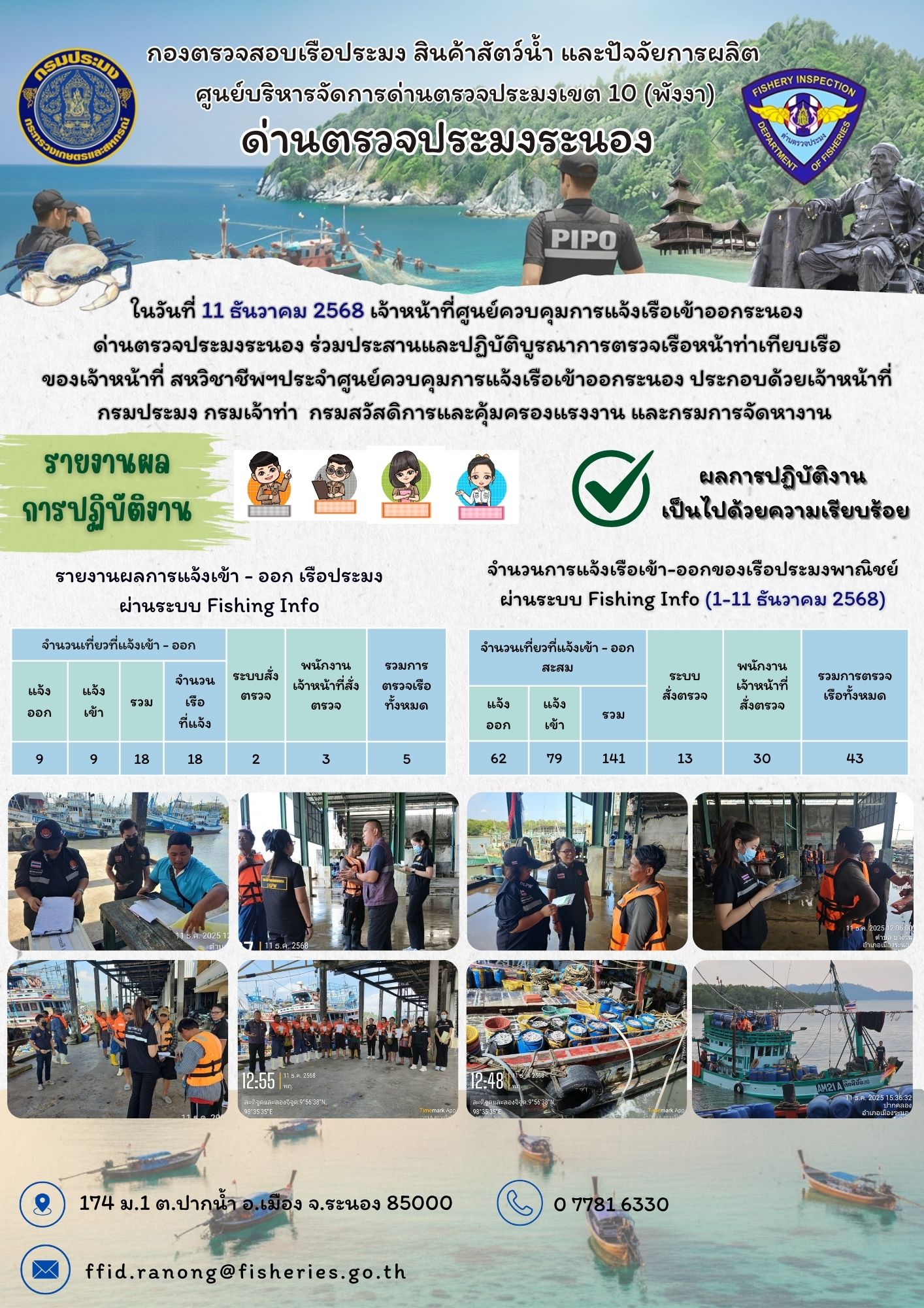 ในวันที่ 11 ธันวาคม 2568 เจ้าหน้าที่ศูนย์ควบคุมการแจ้งเรือเข้าออกระนองด่านตรวจประมงระนอง ร่วมประสานและปฏิบัติบูรณาการตรวจเรือหน้าท่าเทียบเรือของเจ้าหน้าที่ สหวิชาชีพฯประจำศูนย์ควบคุมการแจ้งเรือเข้าออกระนอง ประกอบด้วยเจ้าหน้าที่กรมประมง กรมเจ้าท่า กรมสวัสดิการและคุ้มครองแรงงาน และกรมการจัดหางาน ผลการปฏิบัติงาน เป็นไปด้วยความเรียบร้อย
