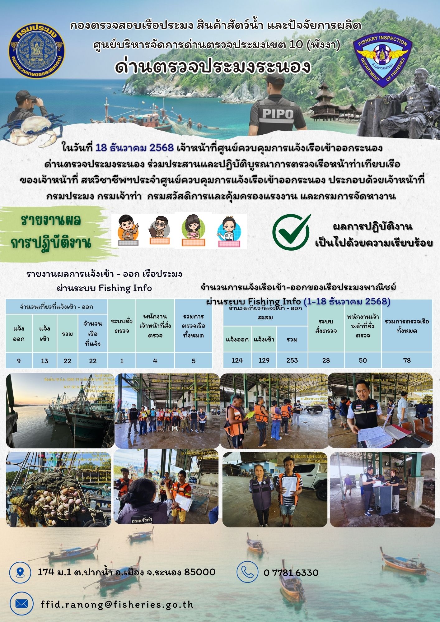 ในวันที่ 18 ธันวาคม 2568 เจ้าหน้าที่ศูนย์ควบคุมการแจ้งเรือเข้าออกระนอง