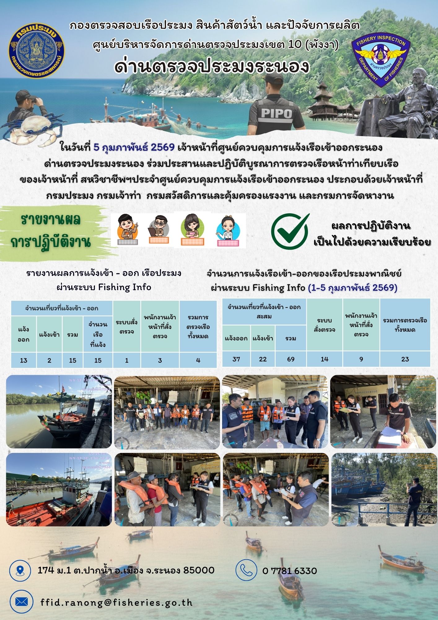 ในวันที่ 5 กุมภาพันธ์ 2569 เจ้าหน้าที่ศูนย์ควบคุมการแจ้งเรือเข้าออกระนอง