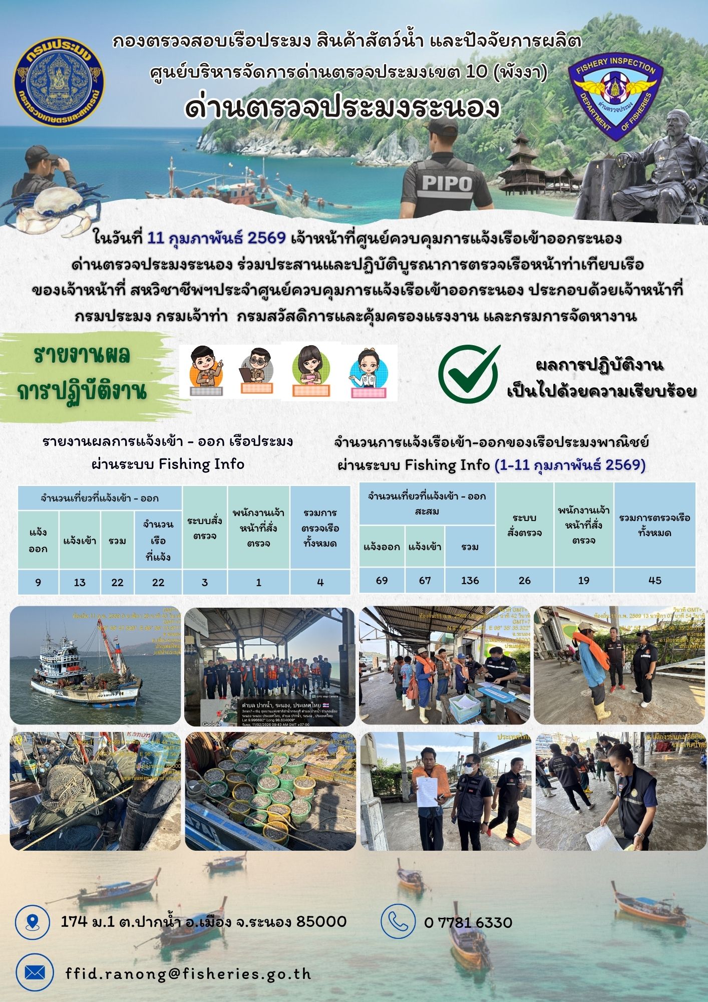 ในวันที่ 11 กุมภาพันธ์ 2569 เจ้าหน้าที่ศูนย์ควบคุมการแจ้งเรือเข้าออกระนอง