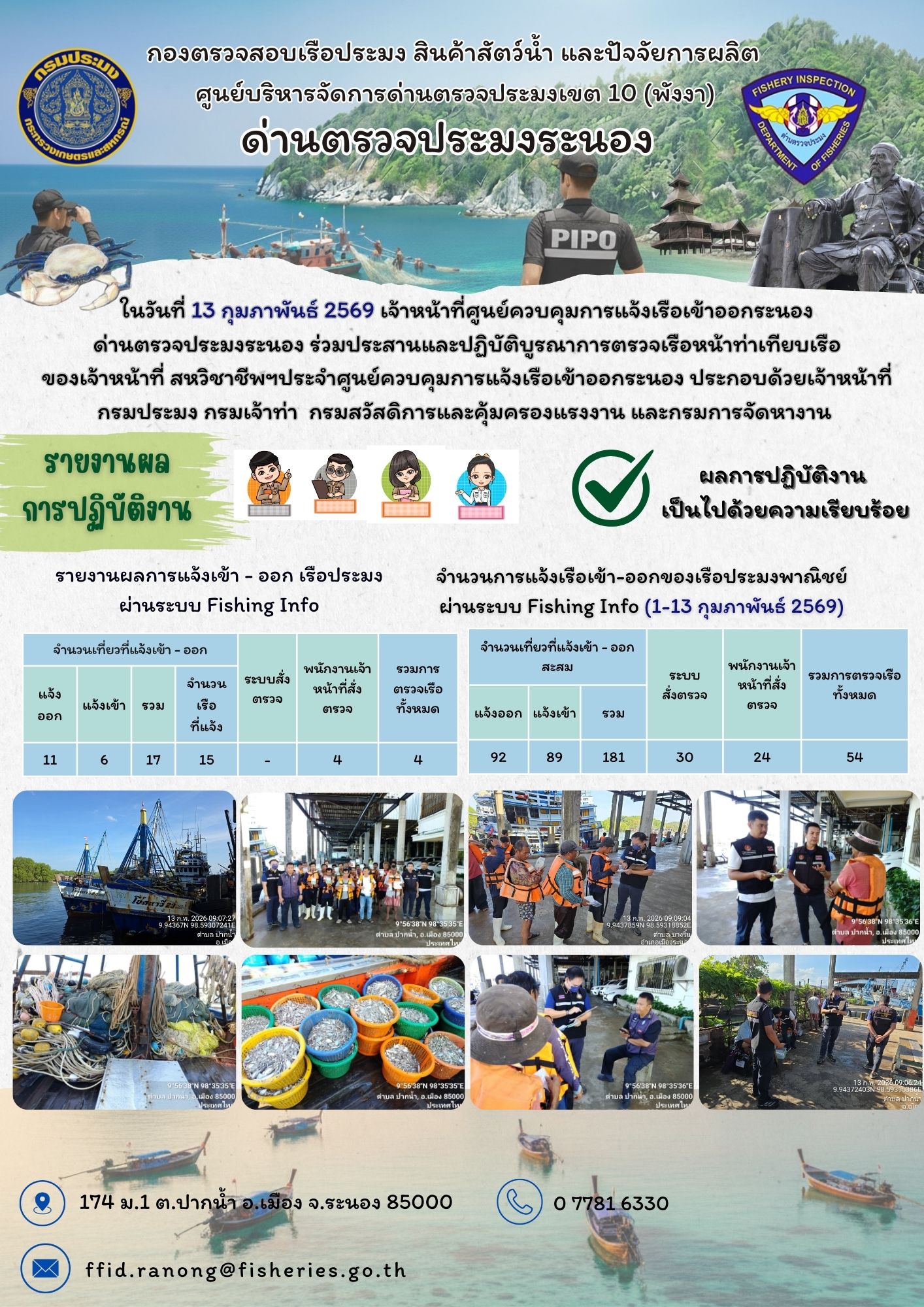 ในวันที่ 13 กุมภาพันธ์ 2569 เจ้าหน้าที่ศูนย์ควบคุมการแจ้งเรือเข้าออกระนอง