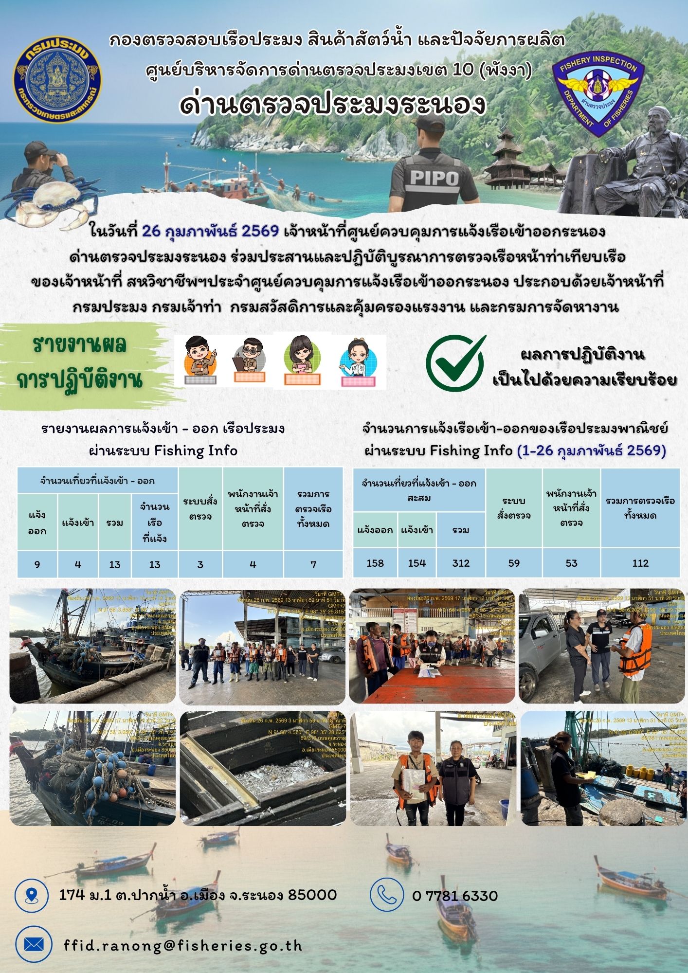 ในวันที่ 26 กุมภาพันธ์ 2569 เจ้าหน้าที่ศูนย์ควบคุมการแจ้งเรือเข้าออกระนอง