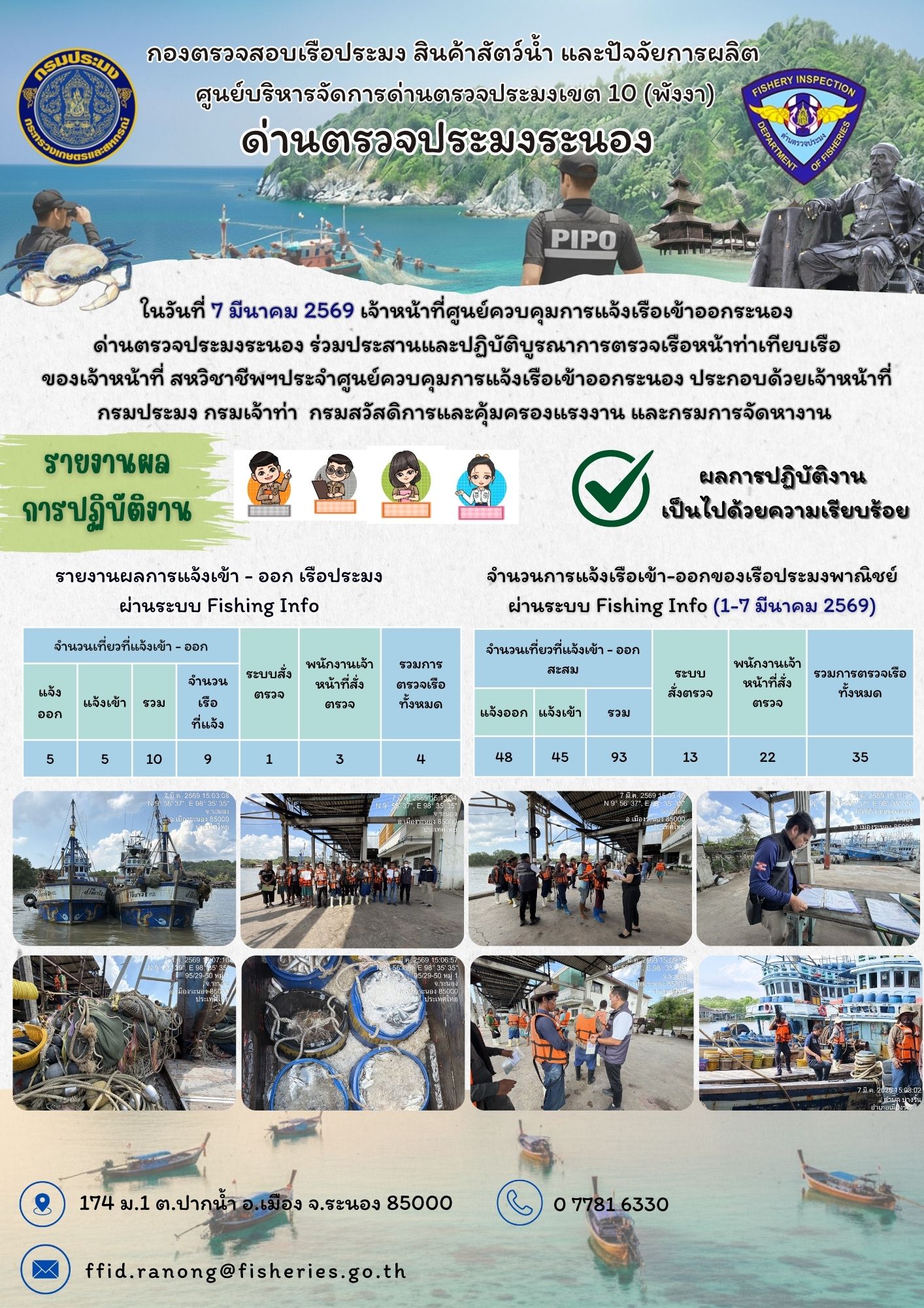 ในวันที่ 7 มีนาคม 2569 เจ้าหน้าที่ศูนย์ควบคุมการแจ้งเรือเข้าออกระนอง