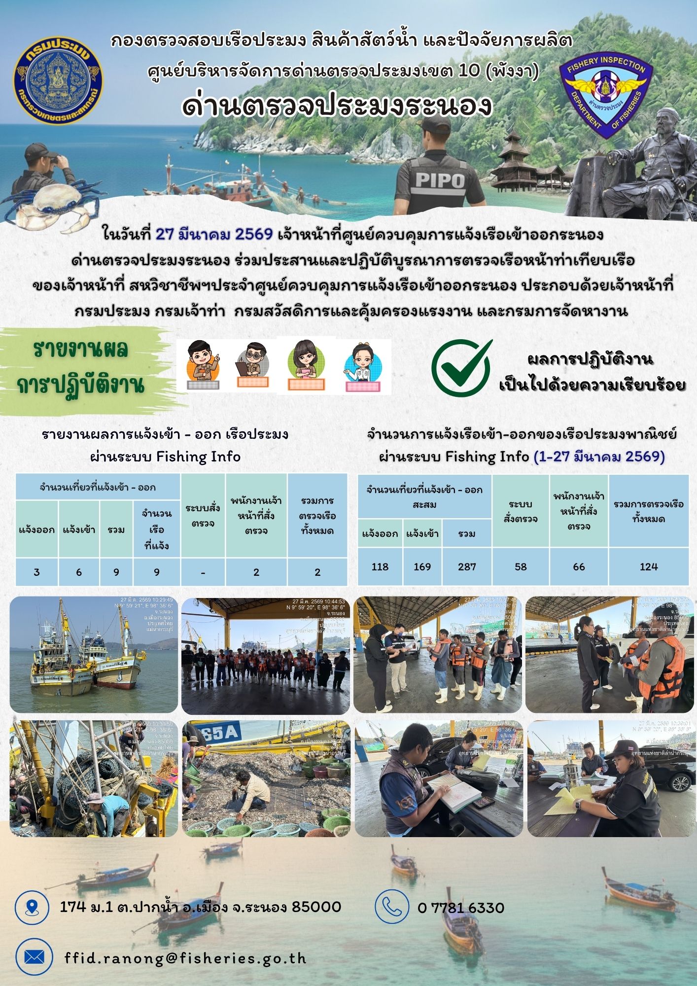 ในวันที่ 27 มีนาคม 2569 เจ้าหน้าที่ศูนย์ควบคุมการแจ้งเรือเข้าออกระนอง