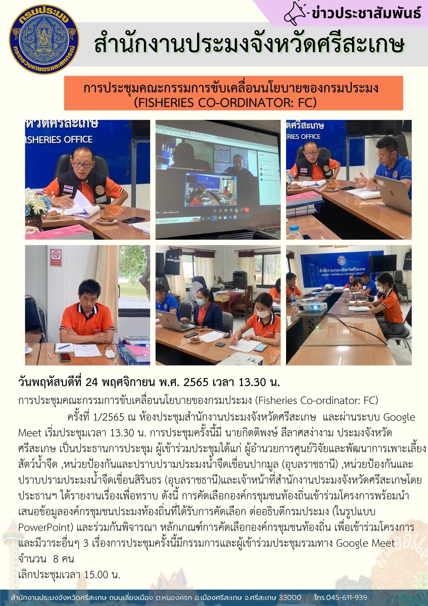 ครั้งที่ 1/2565 ณ ห้องประชุมสำนักงานประมงจังหวัดศรีสะเกษ และผ่านระบบ Google Meet