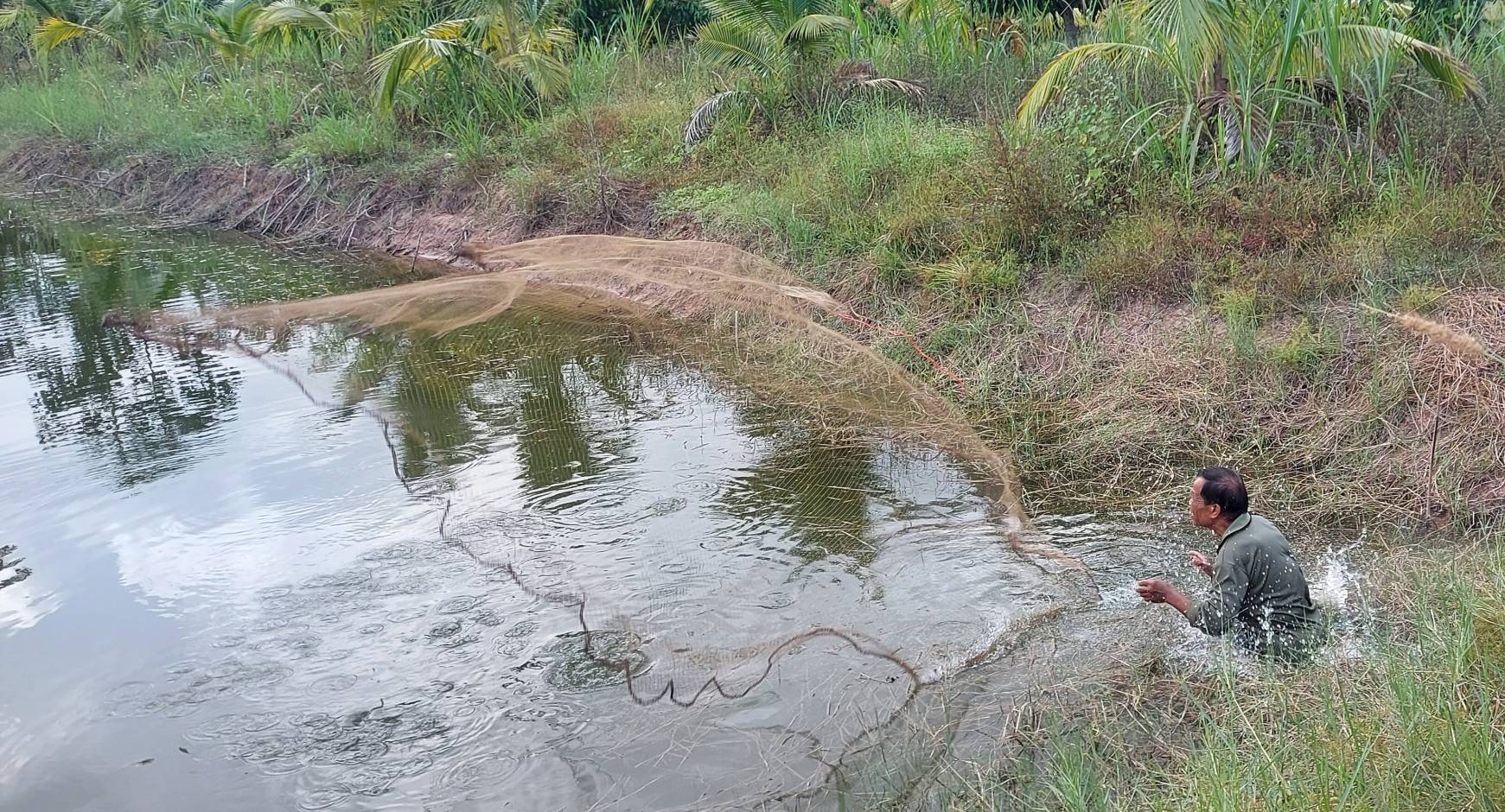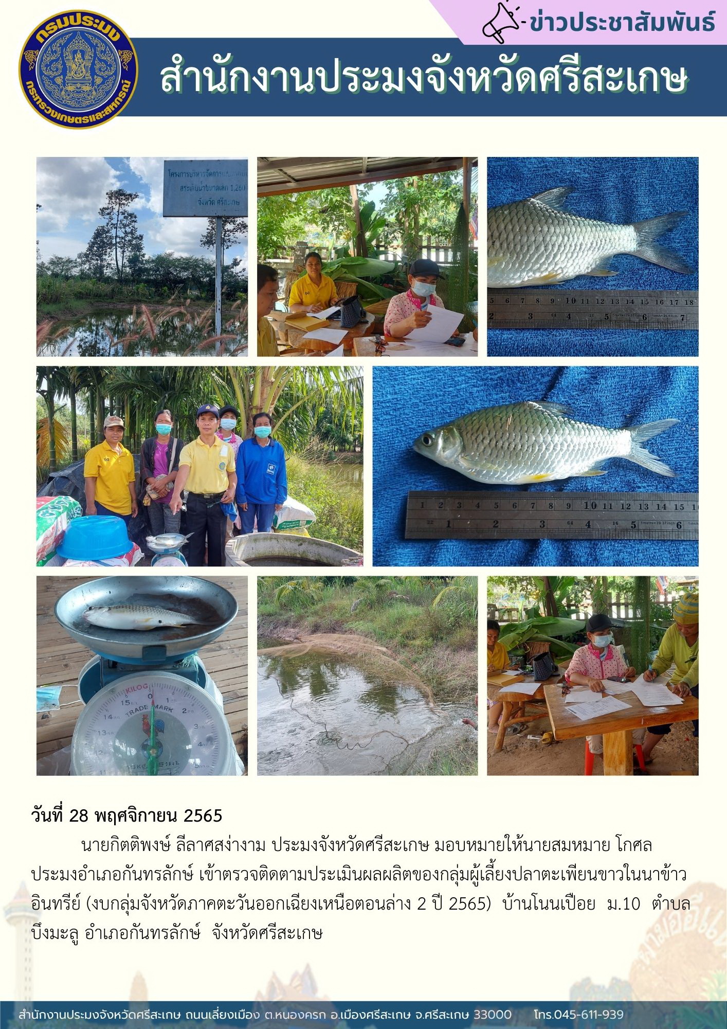 นายกิตติพงษ์ ลีลาศสง่างาม ประมงจังหวัดศรีสะเกษ มอบหมายให้นายสมหมาย โกศล ประมงอำเภอกันทรลักษ์ เข้าตรวจติดตามประเมินผลผลิตของกลุ่มผู้เลี้ยงปลาตะเพียนขาวในนาข้าวอินทรีย์ (งบกลุ่มจังหวัดภาคตะวันออกเฉียงเหนือตอนล่าง 2 ปี 2565) บ้านโนนเปือย ม.10 ตำบลบึงมะลู อำเภอกันทรลักษ์ จังหวัดศรีสะเกษ