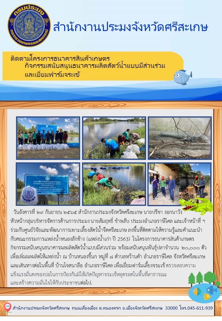 สำนักงานประมงจังหวัดศรีสะเกษ โดย นายปรีชา งอกนาวัง  หัวหน้ากลุ่มบริหารจัดการด้านการประมง นายสัมฤทธิ์ ขำพลับ ประมงอำเภอราษีไศล และเจ้าหน้าที่ ฯ ร่วมกับศูนย์วิจัยและพัฒนาการเพาะเลี้ยงสัตว์น้ำจืดศรีสะเกษ   ลงพื้นที่ติดตามให้ความรู้และคำแนะนำ กับคณะกรรมการแหล่งน้ำหนองลักช้าง (แหล่งน้ำเก่า ปี 2563)  ในโครงการธนาคารสินค้าเกษตร กิจกรรมสนับสนุนธนาคารผลผลิตสัตว์น้ำแบบมีส่วนร่วม พร้อมสนับสนุนพันธุ์ปลาจำนวน  ๒๐,๐๐๐ ตัว เพื่อเพิ่มผลผลิตให้แหล่งน้ำ ณ บ้านหนองขี้นก หมู่ที่ ๘ ตำบลหว้านคำ อำเภอราษีไศล จังหวัดศรีสะเกษ และเดินทางต่อในพื้นที่ บ้านโจดนาลือ อำเภอราษีไศล เพื่อเยี่ยมฟาร์มเลี้ยงจระเข้ ตรวจสอบความแข็งแรงมั่นคงของบ่อในการป้องกันมิให้เกิดปัญหาจระเข้หลุดรอดในพื้นที่สาธารณะและสร้างความมั่นใจให้กับประชาชนต่อไป.
