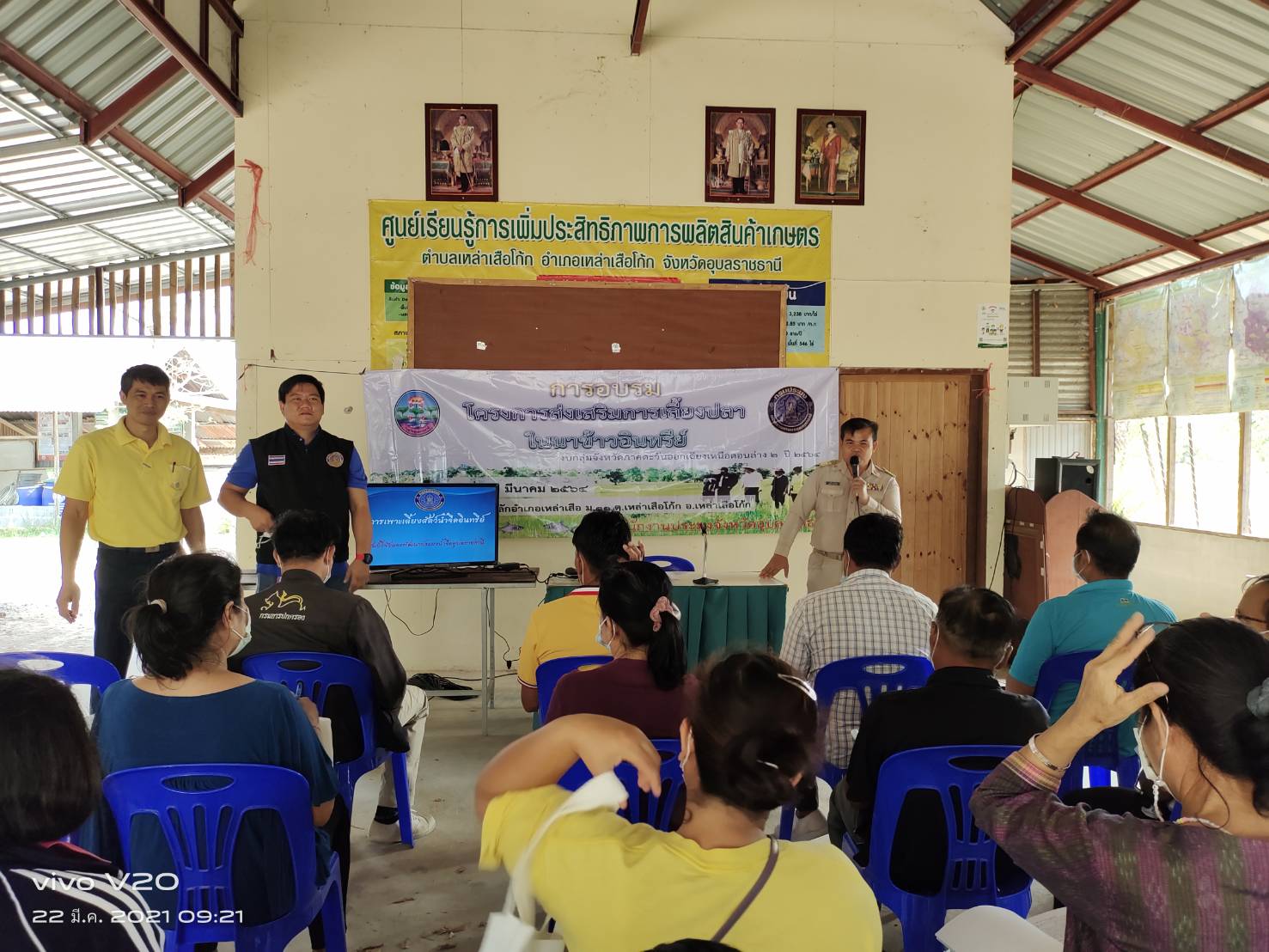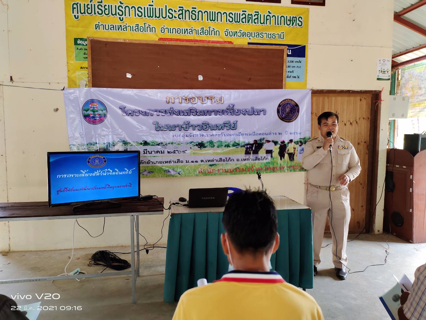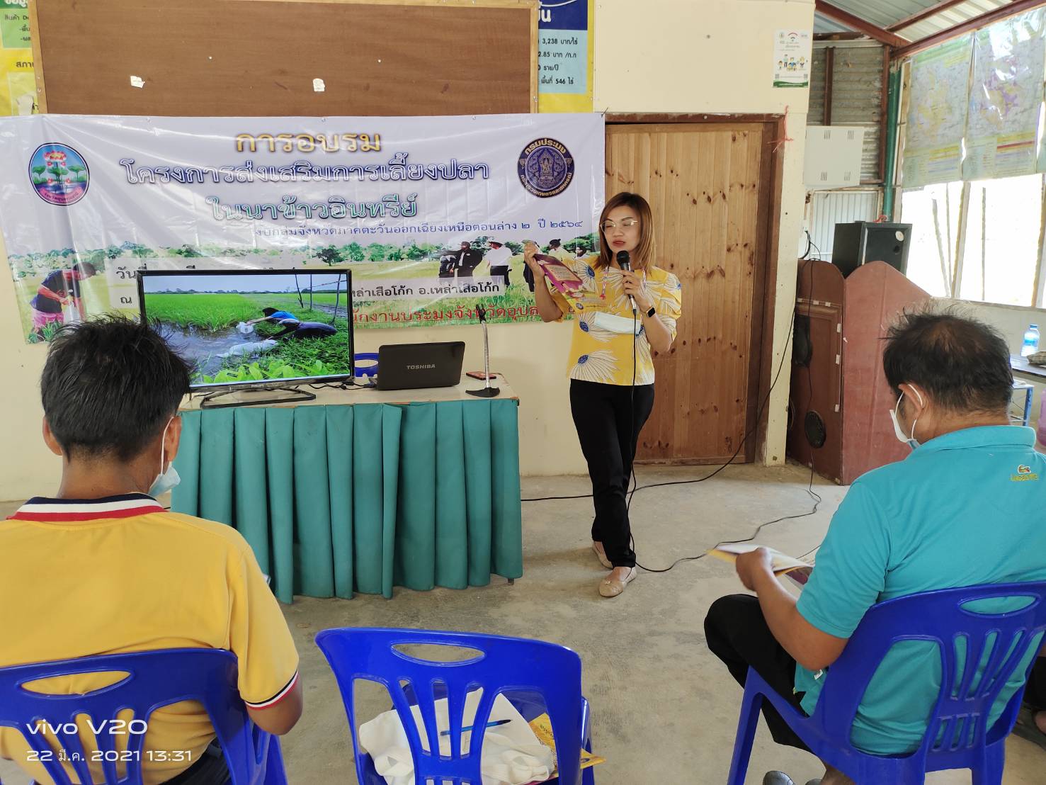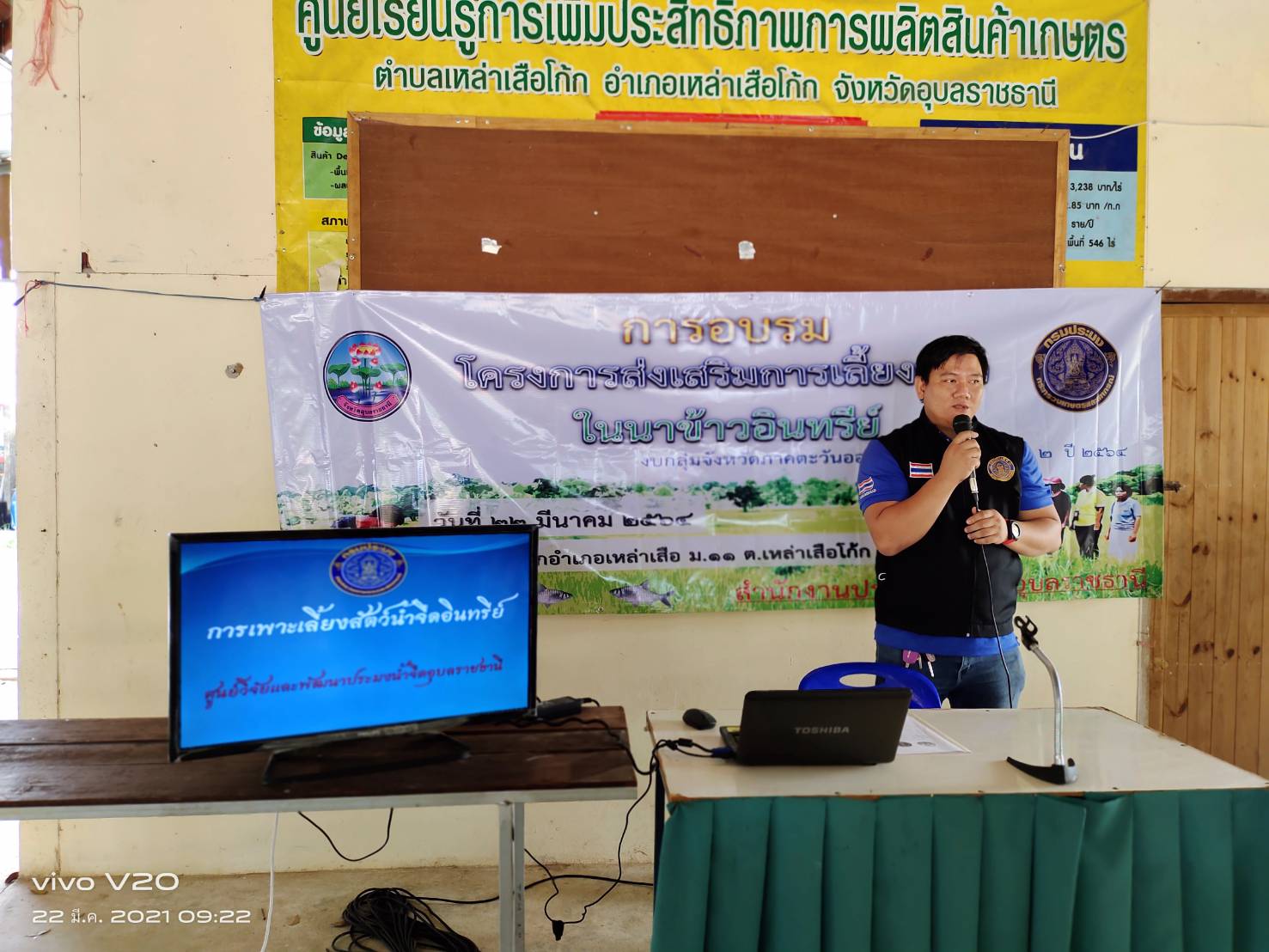 วันที่  22 มีนาคม 2564  นายธงชัย ชาตำแย ประมงอำเภอม่วงสามสิบ รับผิดชอบงานอำเภอเหล่าเสือโก้กนางสาวศิริรัตน์ อุทัยวัฒน์ เจ้าพนักงานปฏิบัติงาน และ ว่าที่ ร.ต. วุฒิชาติ เชื้อชม เจ้าพนักงานประมง ลงพื้นที่ดำเนินงานตามโครงการส่งเสริมการเลี้ยงปลาในนาข้าวอินทรีย์ งบกลุ่มจังหวัดภาคตะวันออกเฉียงเหนือตอนล่าง 2 ปี 2564 จัดอบรมเสริมสร้างองค์ความรู้ด้านการเลี้ยงสัตว์น้ำอินทรีย์ แก่เกษตรกร จำนวน 30 ราย ที่เข้าร่วมโครงการฯ ณ ศูนย์การเรียนรู้การเพิ่มประสิทธิภาพการผลิตสินค้าเกษตรประจำอำเภอเหล่าเสือโก้ก ตำบลเหล่าเสือโก้ก อำเภอเหล่าเสือโก้ก จังหวัดอุบลราชธานี ซึ่งในวันนี้ได้รับเกียรติจากเจ้าหน้าที่ศูนย์วิจัยและพัฒนาประมงน้ำจืดอุบลราชธานี และเจ้าหน้าที่จากสำนักงานตรวจบัญชีสหกรณ์อุบลราชธานี ที่ร่วมบูรณางานถ่ายทอดองค์ความรู้ด้านการเพาะเลี้ยงสัตว์น้ำตามมาตรฐานสัตว์น้ำอินทรีย์ และการจัดทำบัญชีรายรับ – รายจ่าย แก่เกษตรกรที่เข้าร่วมโครงการฯ
