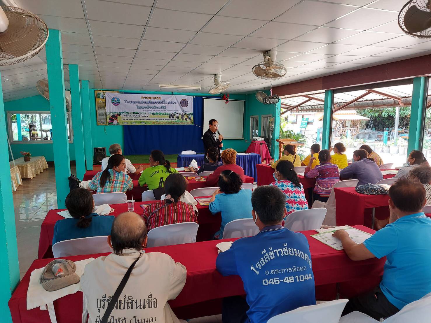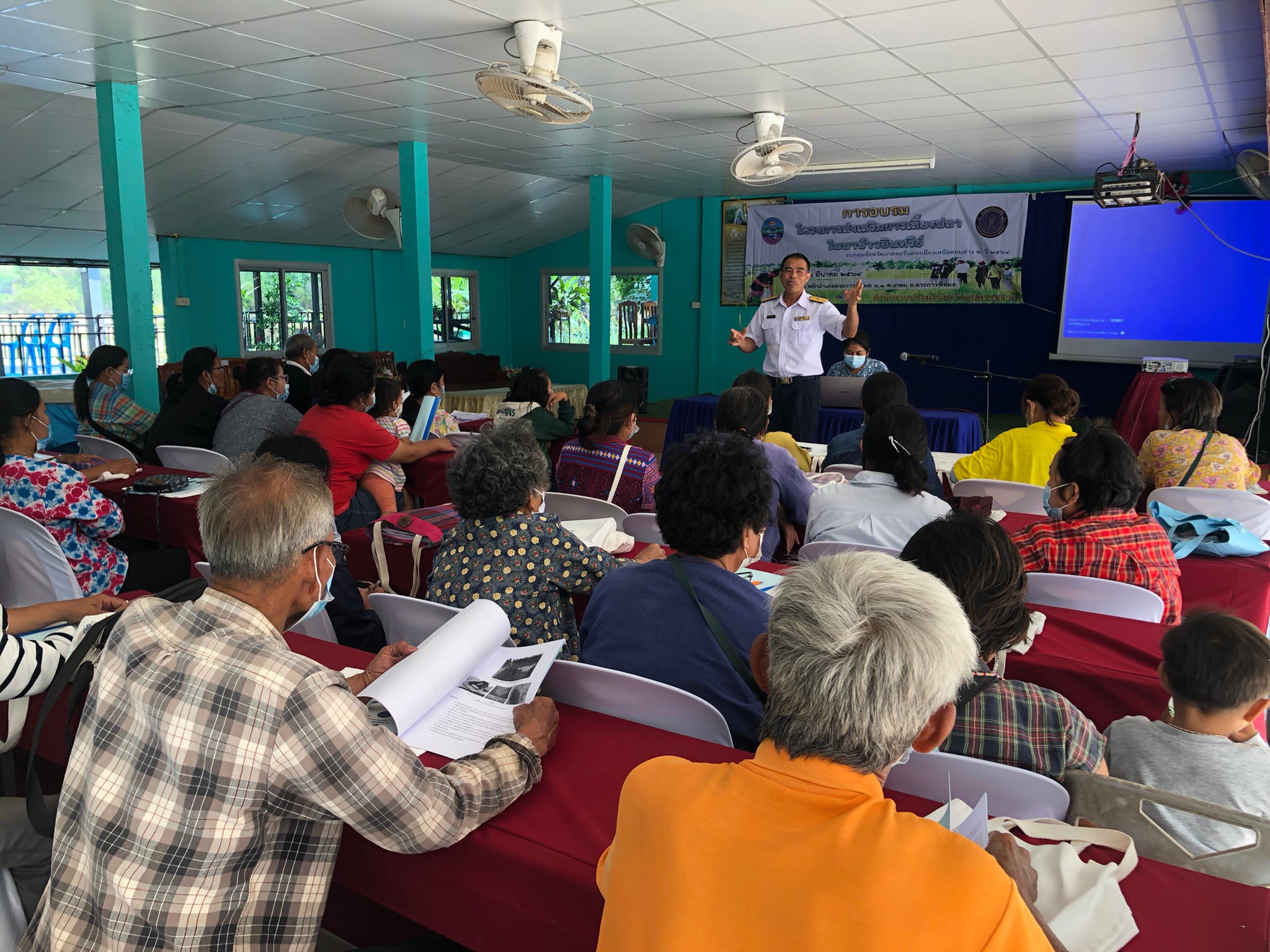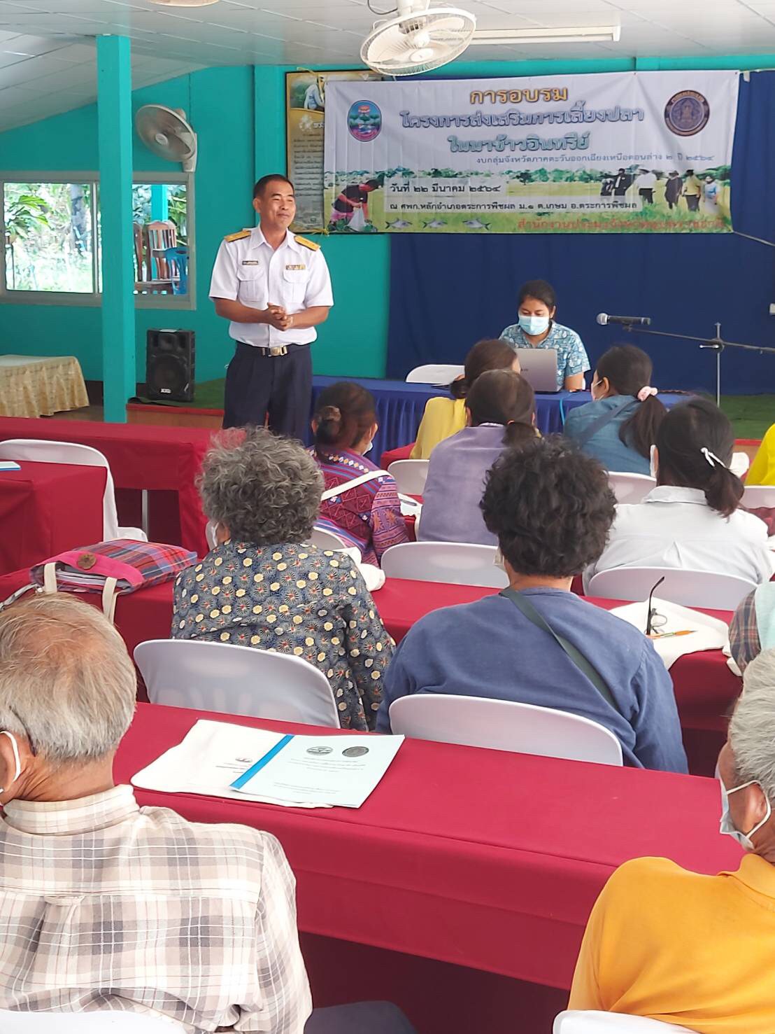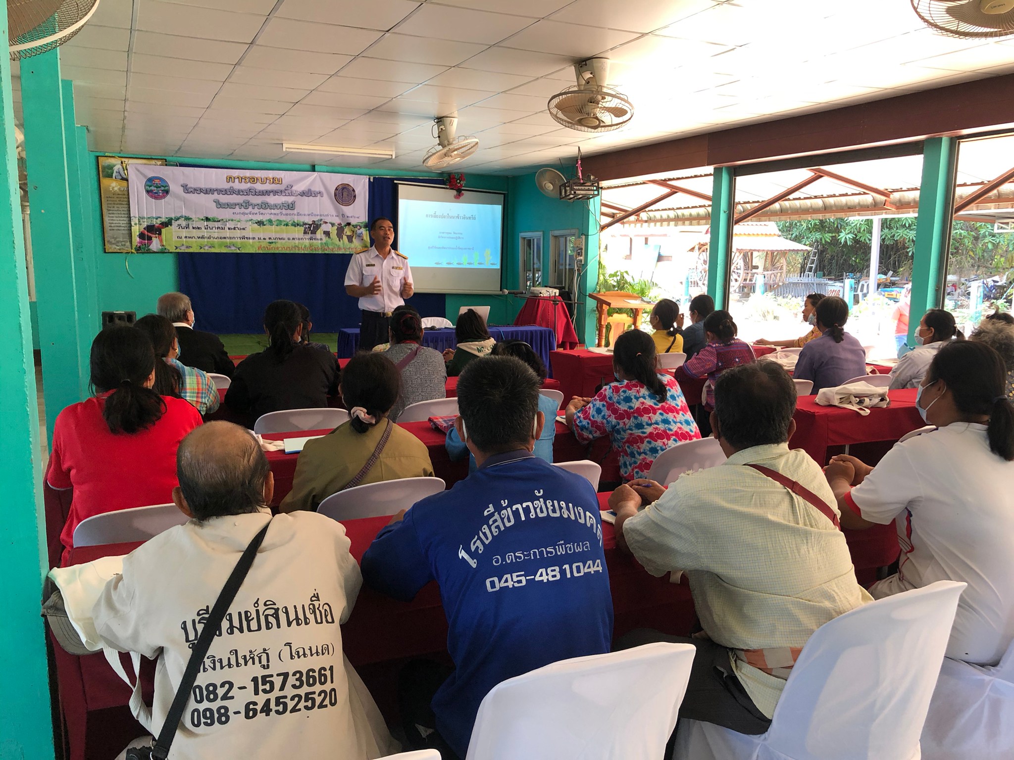 วันที่ 22 มีนาคม 2564 นายประชุม ดวนใหญ่ นักวิชาการประมงชำนาญการพิเศษ และนายบัญชา ไกยสิทธิ์ นักวิชาการประมง ลงพื้นที่ดำเนินงานตามโครงการส่งเสริมการเลี้ยงปลาในนาข้าวอินทรีย์ งบกลุ่มจังหวัดภาคตะวันออกเฉียงเหนือตอนล่าง 2 ปี 2564 จัดอบรมเสริมสร้างองค์ความรู้ด้านการเลี้ยงสัตว์น้ำอินทรีย์ แก่เกษตรกร จำนวน 30 ราย  ณ ศูนย์การเรียนรู้การเพิ่มประสิทธิภาพการผลิตสินค้าเกษตรประจำอำเภอตระการพืชผล ตำบลเกษม อำเภอตระการพืชผล จังหวัดอุบลราชธานี ซึ่งในวันนี้ได้รับเกียรติจากเจ้าหน้าที่ศูนย์วิจัยและพัฒนาประมงน้ำจืดอุบลราชธานี และเจ้าหน้าที่จากสำนักงานตรวจบัญชีสหกรณ์อุบลราชธานี ที่ร่วมบูรณางานถ่ายทอดองค์ความรู้ด้านการเพาะเลี้ยงสัตว์น้ำตามมาตรฐานสัตว์น้ำอินทรีย์ และการจัดทำบัญชีรายรับ – รายจ่าย แก่เกษตรกรที่เข้าร่วมโครงการฯ