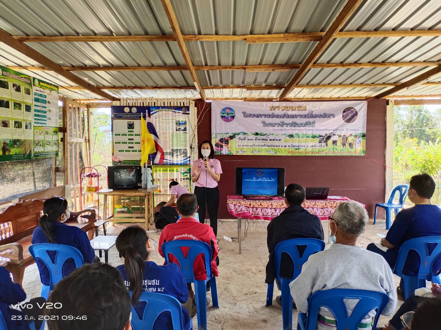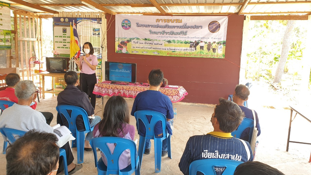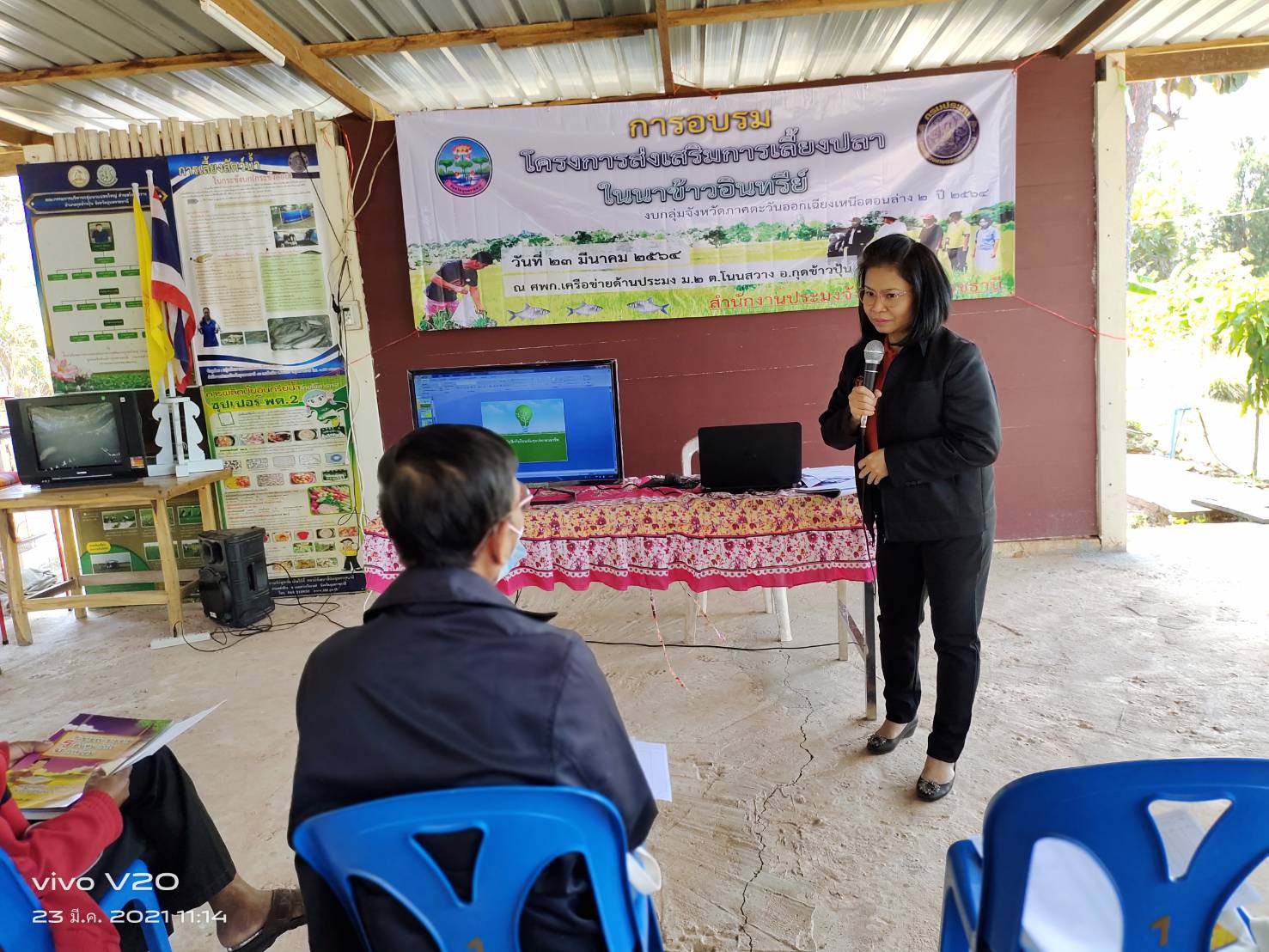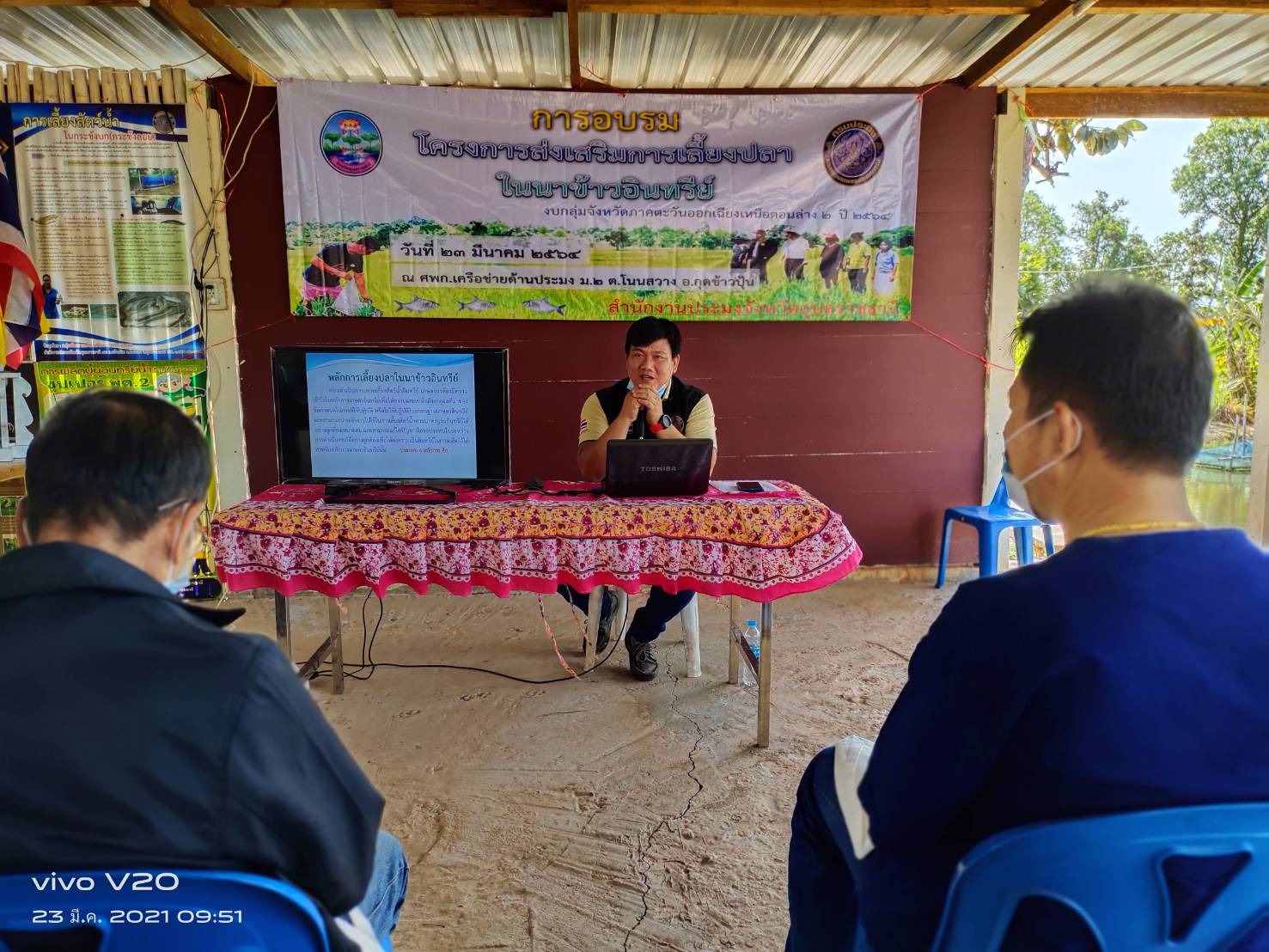 วันที่  23 มีนาคม 2564  นางสาวศิริรัตน์ อุทัยวัฒน์ เจ้าพนักงานประมงปฏิบัติงาน และว่าที่ ร.ต. วุฒิชาติ เชื้อชม เจ้าพนักงานประมง สำนักงานประมงจังหวัดอุบลราชธานี พร้อมด้วยนางสาวปวริศา บุตรนามท้าว ประมงอำเภอโพธิ์ไทร บูรณางานร่วมกับศูนย์วิจัยและพัฒนาประมงน้ำจืดเขต 4 อุบลราชธานี และเจ้าหน้าที่จากสำนักงานตรวจบัญชีสหกรณ์  อบรมถ่ายทอดองค์ความรู้ด้านการเพาะเลี้ยงสัตว์น้ำตามมาตรฐานสัตว์น้ำอินทรีย์ การสร้างอาหารธรรมชาติในนาข้าวและบ่อดิน และการบันทึกรายรับ – รายจ่าย แก่เกษตรกรผู้เข้าอบรมโครงการส่งเสริมการเลี้ยงปลาในนาข้าวอินทรีย์ จังหวัดอุบลราชธานี งบกลุ่มจังหวัดภาคตะวันออกเฉียงเหนือตอนล่าง 2 ปีงบประมาณ 2564 รุ่นที่ 2 จำนวน 30 ราย ณ ศูนย์ศพก.เครือข่าย ด้านการประมงประจำปี 2560 หมู่ที่ 2 ตำบลโนนสวาง อำเภอกุดข้าวปุ้น จังหวัดอุบลราชธานี