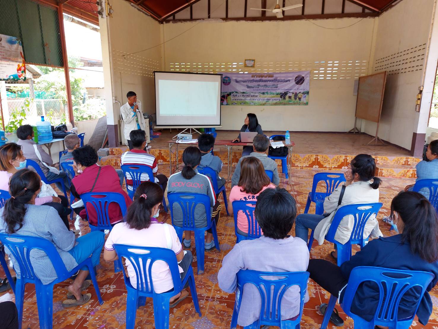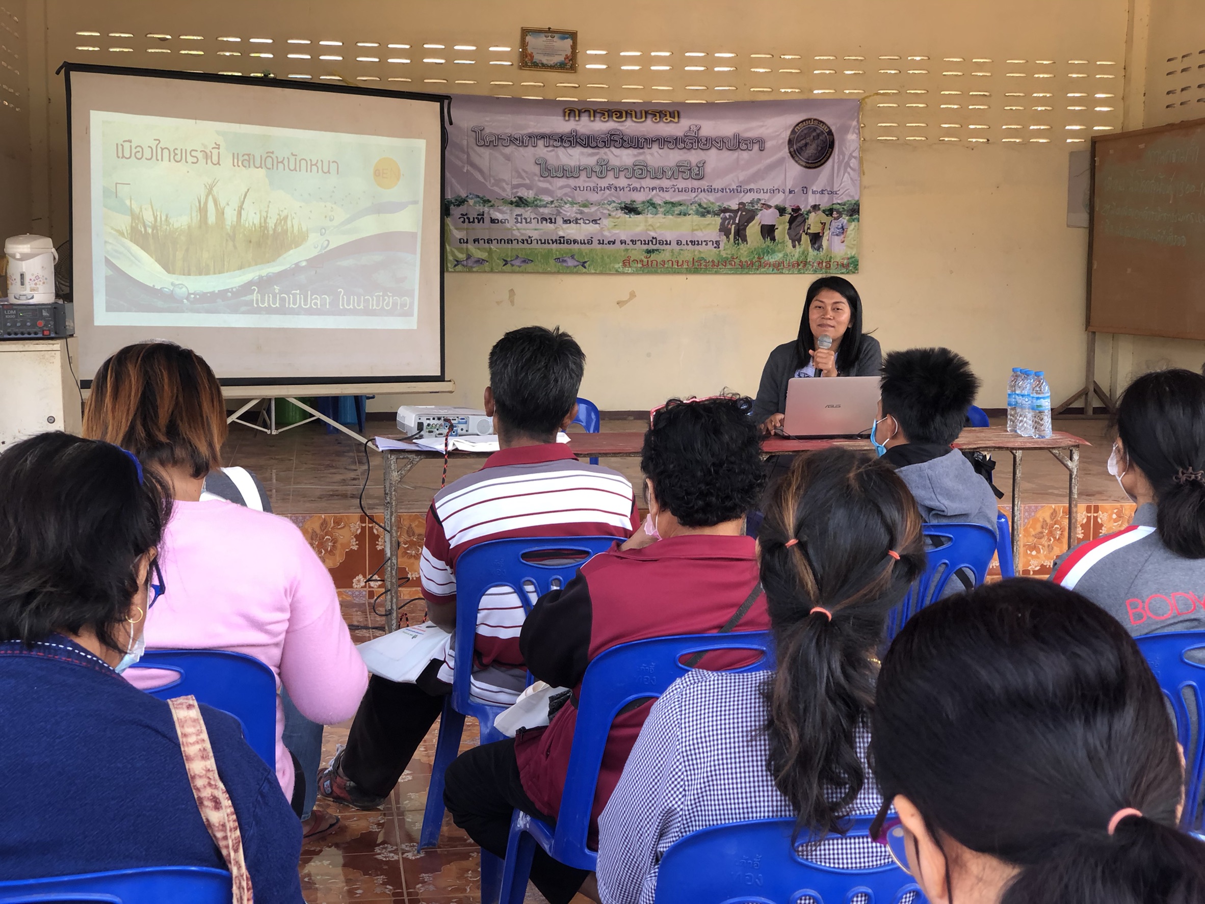 การอบรมโครงการส่งเสริมการเลี้ยงปลาในนาข้าวอินทรีย์ งบกลุ่มจังหวัดภาคตะวันออกเฉียงเหนือตอนล่าง 2 ปี 2564 ณ ศาลากลางบ้านบ้านเหมือดแอ๋ด ตำบลขามป้อม อำเภอเขมราฐ จังหวัดอุบลราชธานี