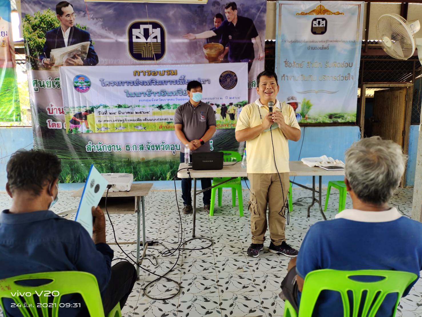 วันที่ 24 มีนาคม 2564  นางสาวศิริรัตน์ อุทัยวัฒน์ เจ้าพนักงานประมงปฏิบัติงาน และว่าที่ ร.ต. วุฒิชาติ เชื้อชม เจ้าพนักงานประมง สำนักงานประมงจังหวัดอุบลราชธานี พร้อมด้วยนายศุภวัฒน์ เที่ยงผดุง ประมงอำเภอศรีเมืองใหม่ บูรณางานร่วมกับศูนย์วิจัยและพัฒนาประมงน้ำจืดเขต 4 อุบลราชธานี และเจ้าหน้าที่จากสำนักงานตรวจบัญชีสหกรณ์  อบรมถ่ายทอดองค์ความรู้ด้านการเพาะเลี้ยงสัตว์น้ำตามมาตรฐานสัตว์น้ำอินทรีย์ การสร้างอาหารธรรมชาติในนาข้าวและบ่อดิน และการบันทึกรายรับ – รายจ่าย แก่เกษตรกรผู้เข้าอบรมโครงการส่งเสริมการเลี้ยงปลาในนาข้าวอินทรีย์ จังหวัดอุบลราชธานี งบกลุ่มจังหวัดภาคตะวันออกเฉียงเหนือตอนล่าง 2 ปีงบประมาณ 2564 รุ่นที่ 3 จำนวน 30 ราย ณ ศูนย์ศพก.เศรษฐกิจพอเพียงต้นแบบ (ธกส.) ม.1 ต.วาริน  อ.ศรีเมืองใหม่ จ.อุบลราชธานี