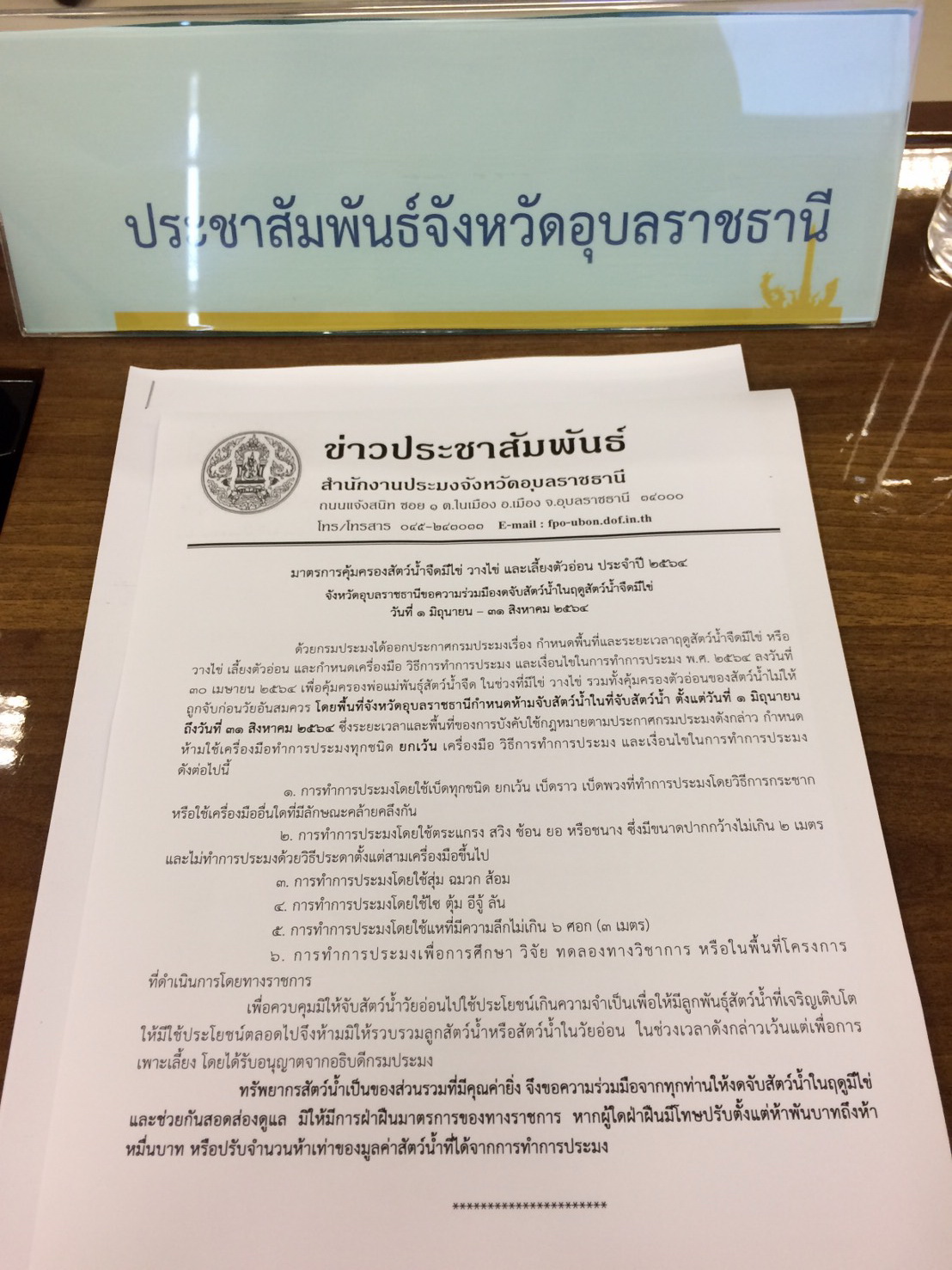 เจ้าหน้าที่สำนักงานประมงจังหวัดอุบลราชธานีแจกเอกสารข่าวประชาสัมพันธ์สำนักงานประมงจังหวัดอุบลราชธานี มาตรการคุ้มครองสัตว์น้ำจืดมีไข่ วางไข่ และเลี้ยงตัวอ่อน ประจำปี 2564 จังหวัดอุบลราชธานี