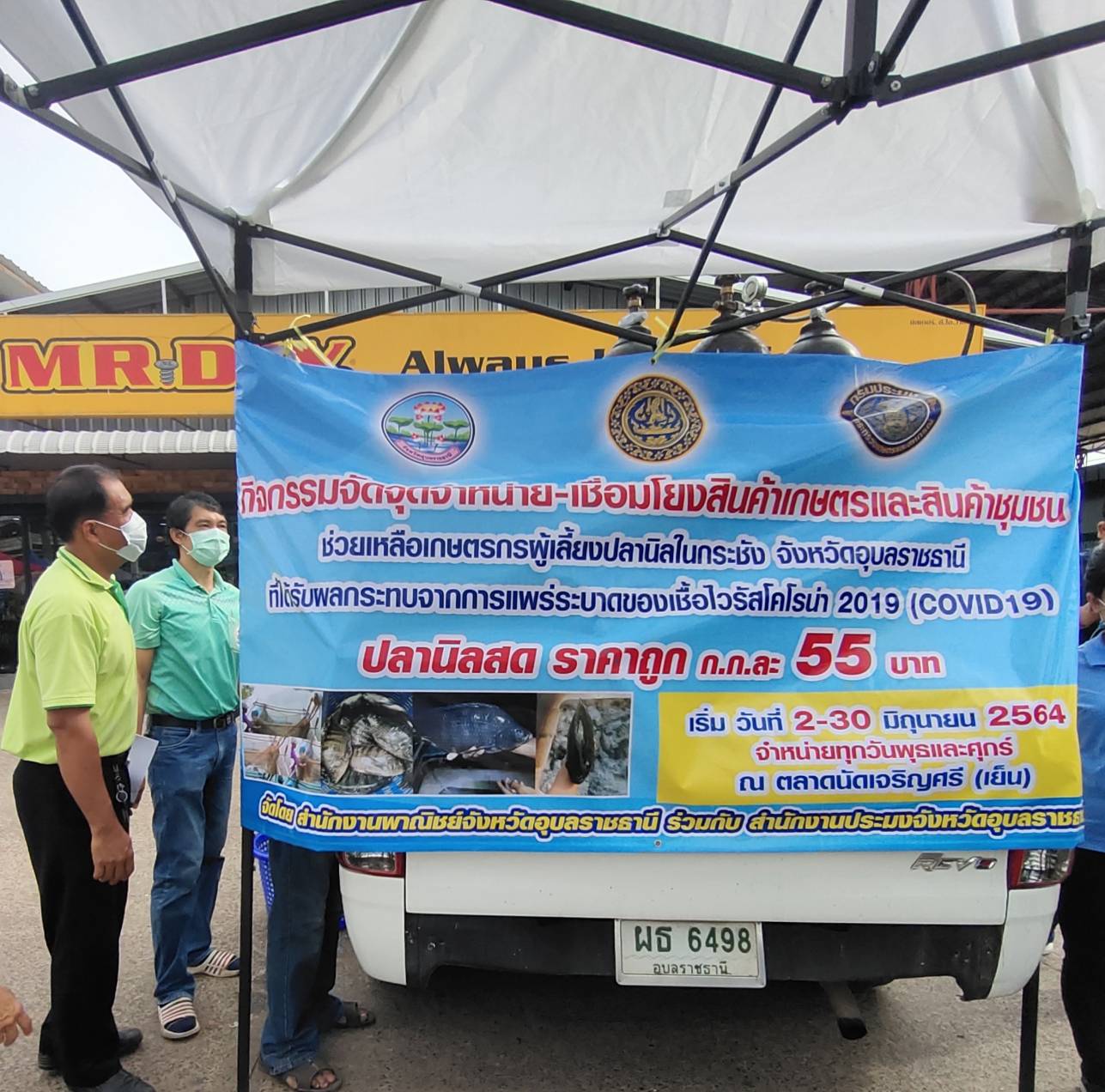 วันที่ 2 มิถุนายน 2564 เวลา 16.20 น. นายศุภกิตติ์ ใสกระจ่าง ประมงจังหวัดอุบลราชธานี ร่วมกับพาณิชย์จังหวัดอุบลราชธานี ให้สัมภาษณ์แก่สถานีข่าววีเคเบิ้ล ทีวีอุบลฯ และจัดกิจกรรมเชื่อมโยงสิ้นค้าเกษตร (ปลานิลสด) ที่ได้รับความเดือดร้อนจากสถานการณ์การแพร่ระบาดของโรคติดเชื้อไวรัสโคโรน่า 2019 (Covid-19) ณ บริเวณหน้าร้าน M.R. D.I.Y ตลาดเจริญศรี อำเภอวารินชำราบ  ซึ่งในการจัดกิจกรรมดังกล่าว มีวัตถุประสงค์เพื่อช่วยเหลือเกษตรกรที่ได้รับผลกระทบจาก สถานการณ์การแพร่ระบาดของไวรัส Covid-19 และบรรเทาความเดือดร้อนให้กับเกษตรกรผู้เลี้ยงปลานิลในกระชัง โดยเป็นการจัดพื้นที่ให้เกษตรกรมาจำหน่ายโดยตรง ไม่ผ่านพ่อค้าคนกลาง สินค้าที่มีจำหน่าย ได้แก่ปลานิลสด จำหน่ายกิโลกรัมละ 55 บาท ซึ่งในการจัดกิจกรรมและเปิดจุดจำหน่ายปลานิลสด ณ บริเวณหน้าร้าน M.R. D.I.Y ตลาดเจริญศรี ทุกวันพุธและวันศุกร์ เริ่มตั้งแต่วันที่ 2-30 มิถุนายน 2564