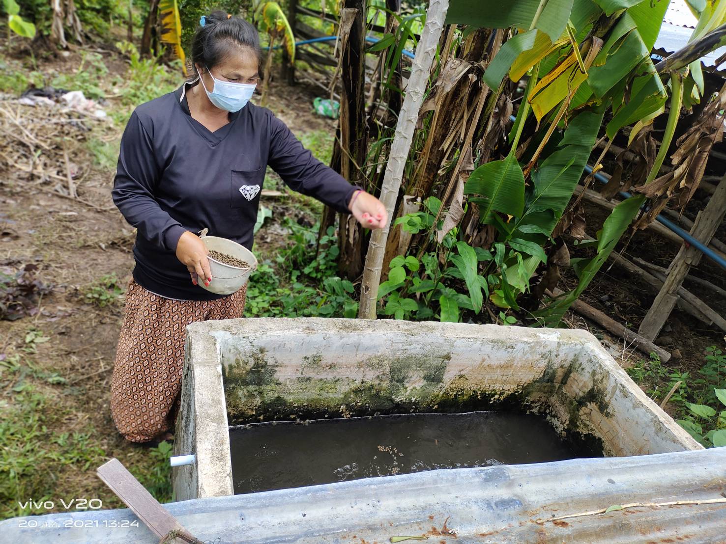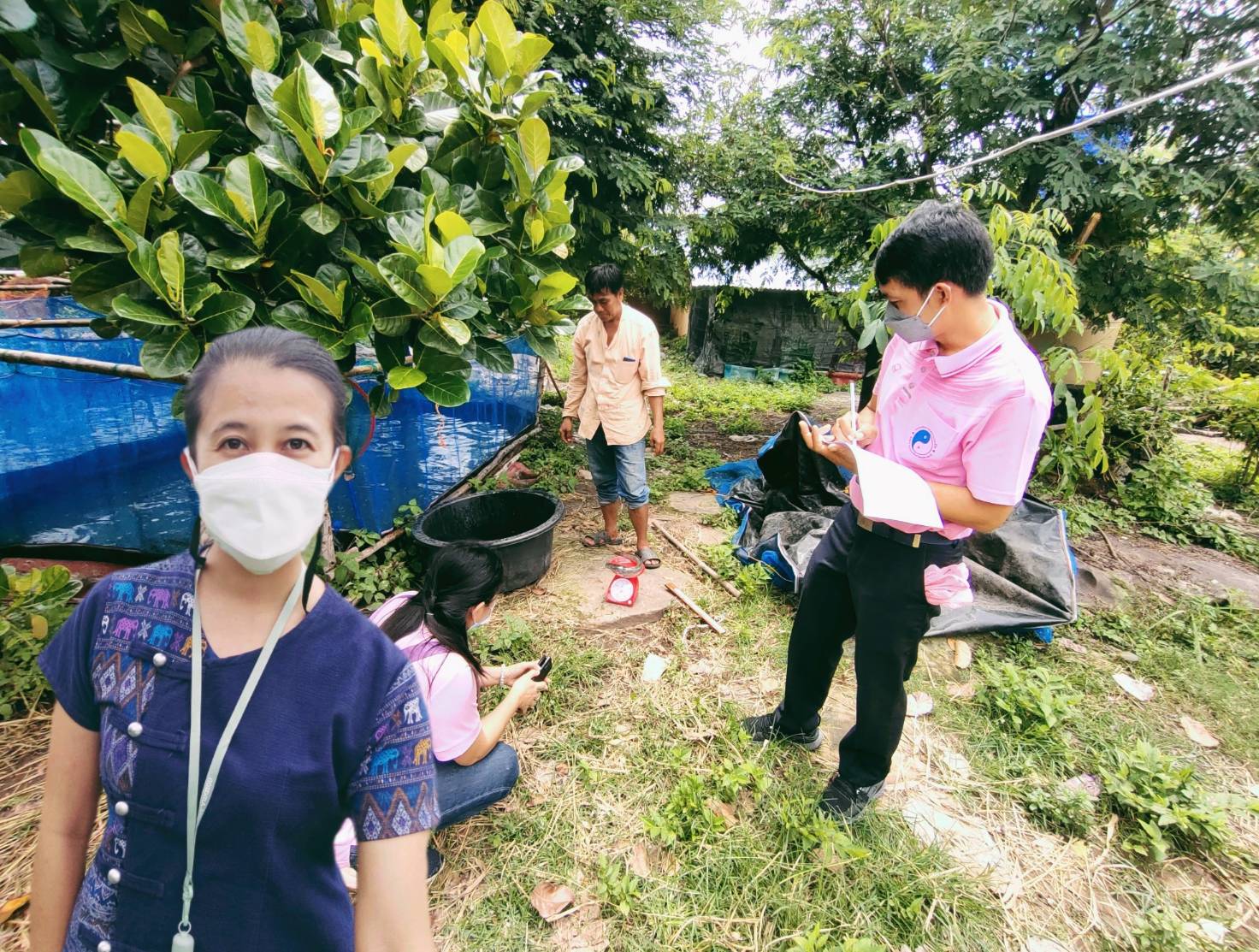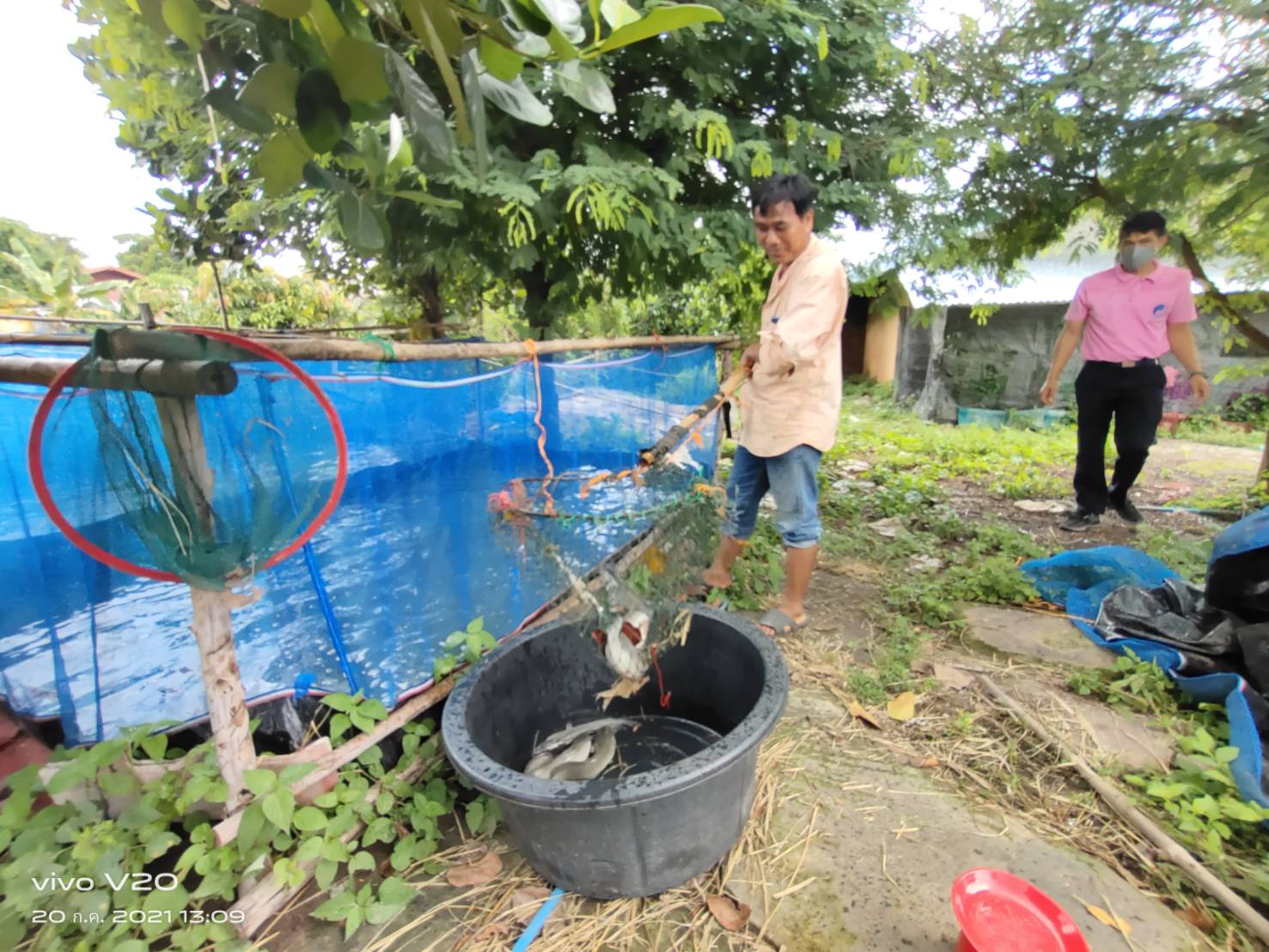 การลงพื้นตรวจติดตามผลผลิตปลาดุกในกระชังบก ของเกษตรกรที่เข้าร่วมโครงการส่งเสริมและพัฒนาอาชีพเพื่อแก้ปัญหาที่ดินทำกินของเกษตรกร ประจำปี 2564  ในพื้นที่บ้านคำลือชา หมู่ที่ 9 ตำบลช่องเม็ก อำเภอสิรินธร