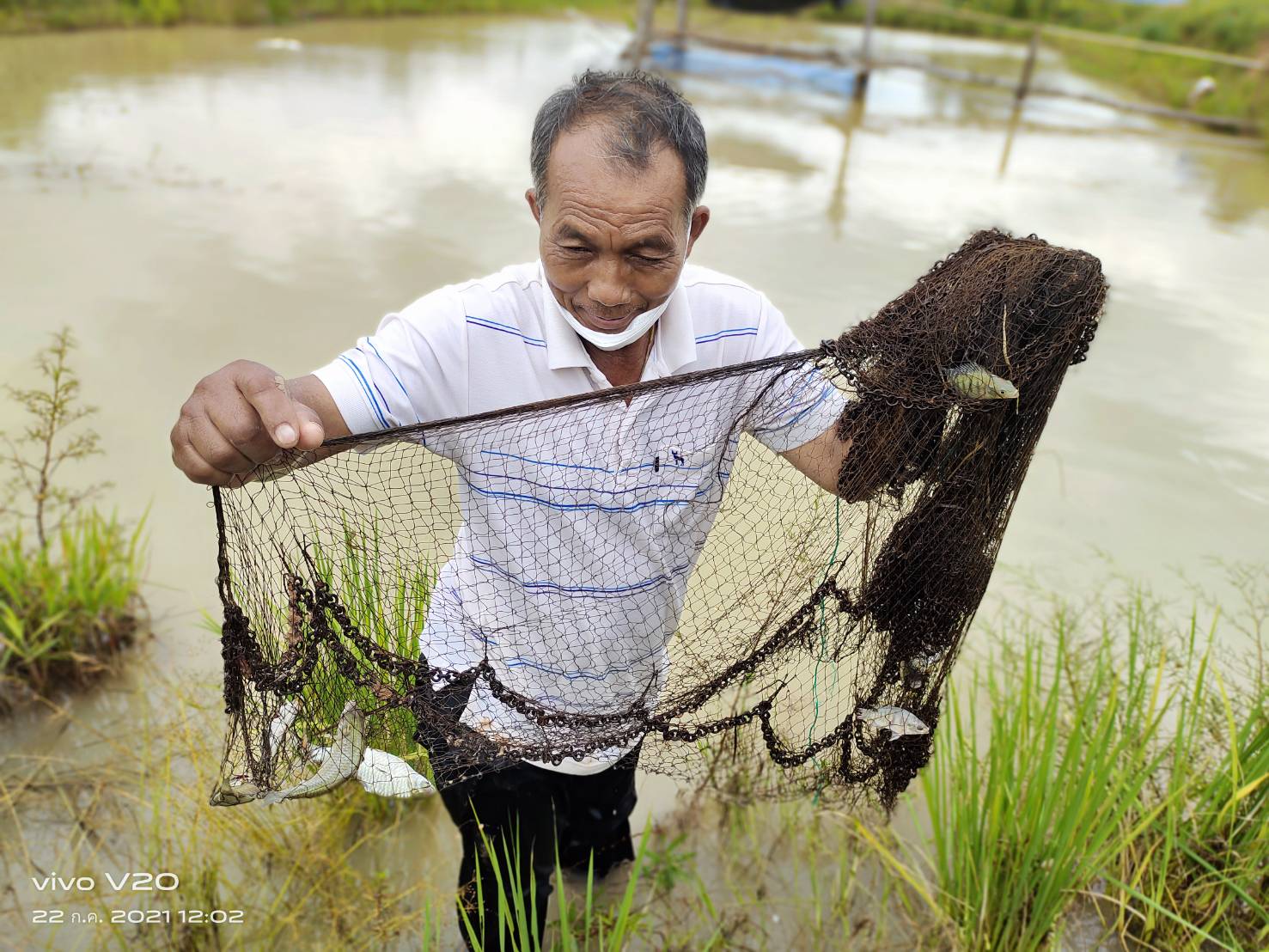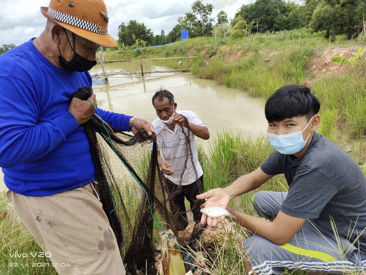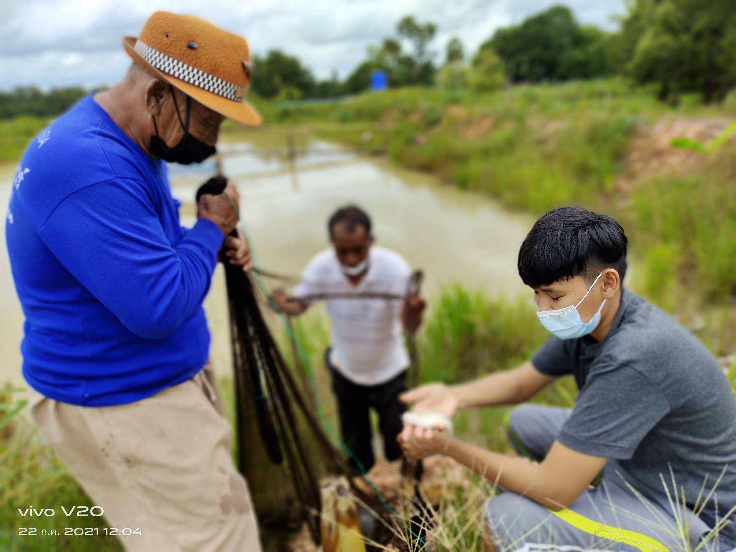 4.ลงพื้นที่เก็บข้อมูลผลผลิตปลาที่สนับสนุนแก่เกษตร ซึ่งหลังจากปล่อยปลาเมื่อวันที่ 18 มิถุนายน 2564 พบว่าปลามีการเจริญเติบโตดี มีน้ำหนักเฉลี่ย 120 กรัม ความยาว 8-10 ซม. โดยเกษตรกรคาดว่าจะจับผลผลิตในอีก 6 เดือนข้างหน้า
