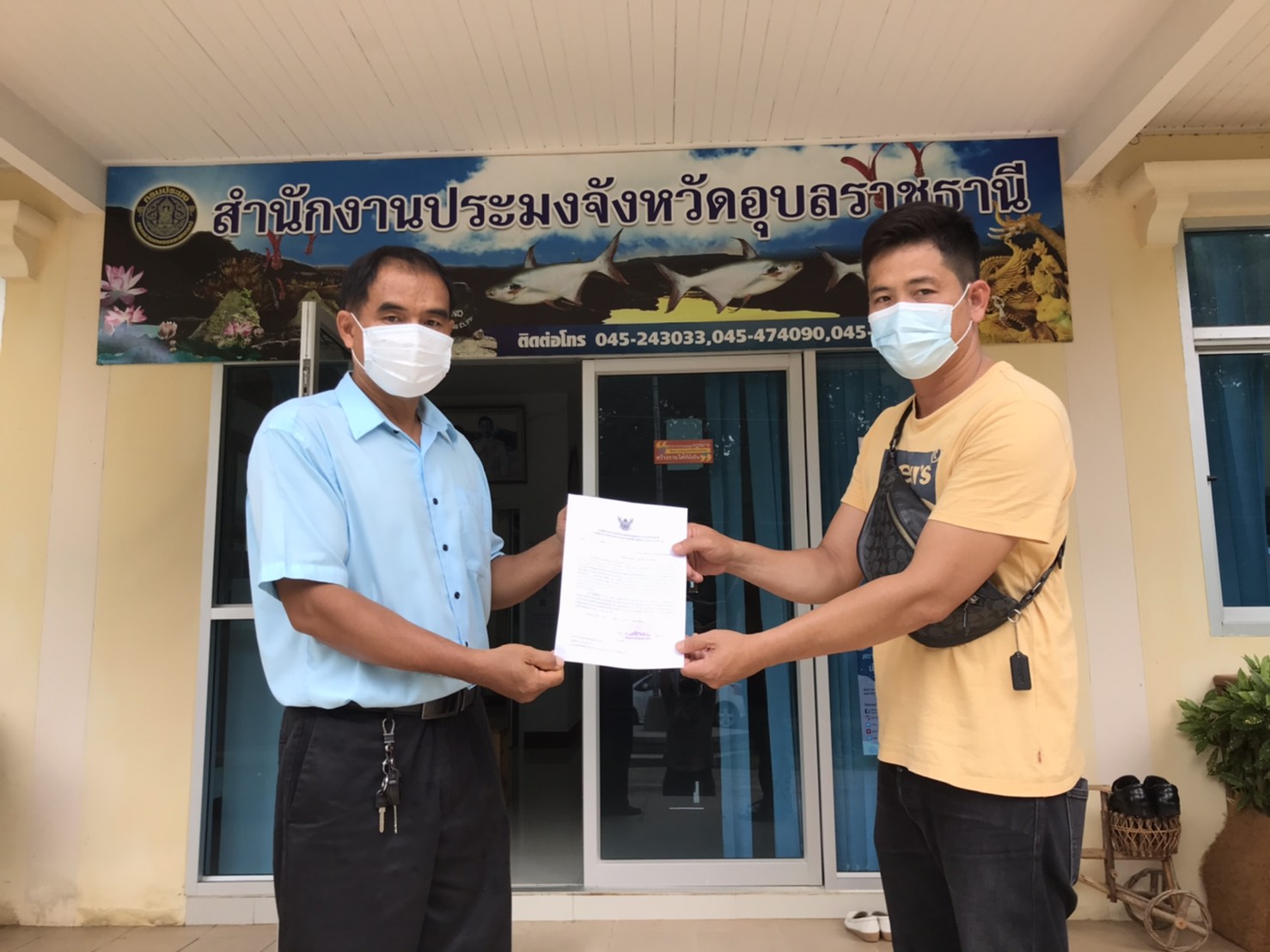 การแพร่ระบาดของโรคติดเชื้อไวรัสโคโรนา 2019 (COVID – 19) ตามประกาศ พรก.ฉุกเฉิน ฉบับที่ 1  แก่เกษตรกรจำนวน 1 ราย โดยมีนายประชุม ดวนใหญ่ หัวหน้ากลุ่มพัฒนาและส่งเสริมอาชีพการประมง เป็นผู้มอบเอกสารดังกล่าวเพื่อเป็นการอำนวยความสะดวกแก่เกษตรกรในการเคลื่อนย้ายลูกพันธุ์สัตว์น้ำข้ามจังหวัด