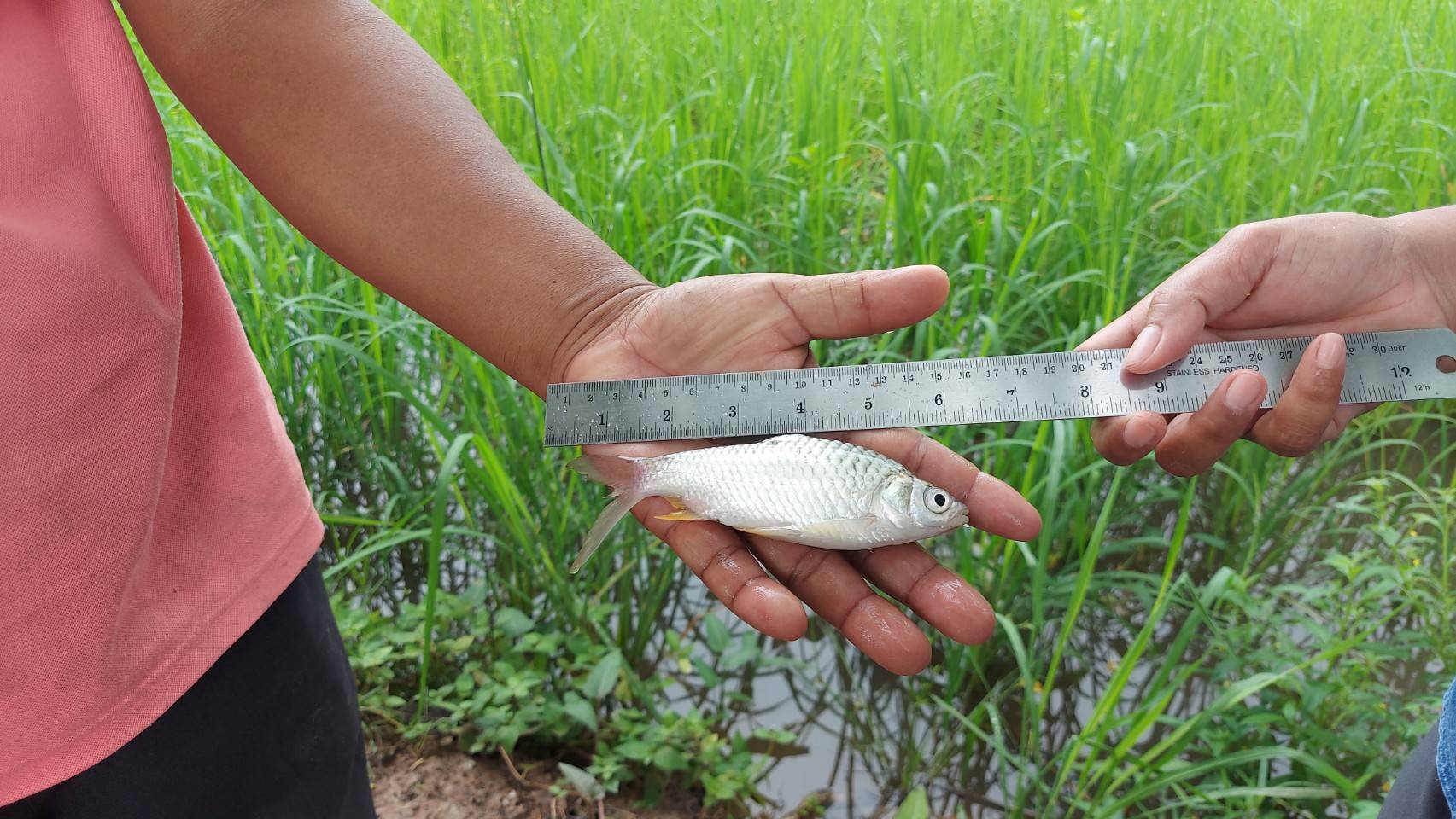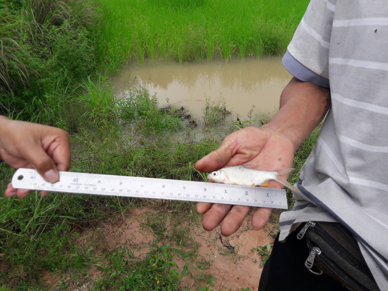 เพื่อติดตามการเจริญเติบโตของปลาที่รับมอบเมื่อวันที่ 22 มิถุนายน 2564 ของเกษตรกร ต.โนนสวาอ.กุดข้าวปุ้น จ.อุบลราชธานี พบว่าปลามีขนาดความยาวประมาณ 8- 14 ซม. ปลามีความแข็งแรงดี น้ำในนาข้าวเริ่มเพิ่มสูงขึ้นปลาเข้ามาอาศัยในแปลงนา