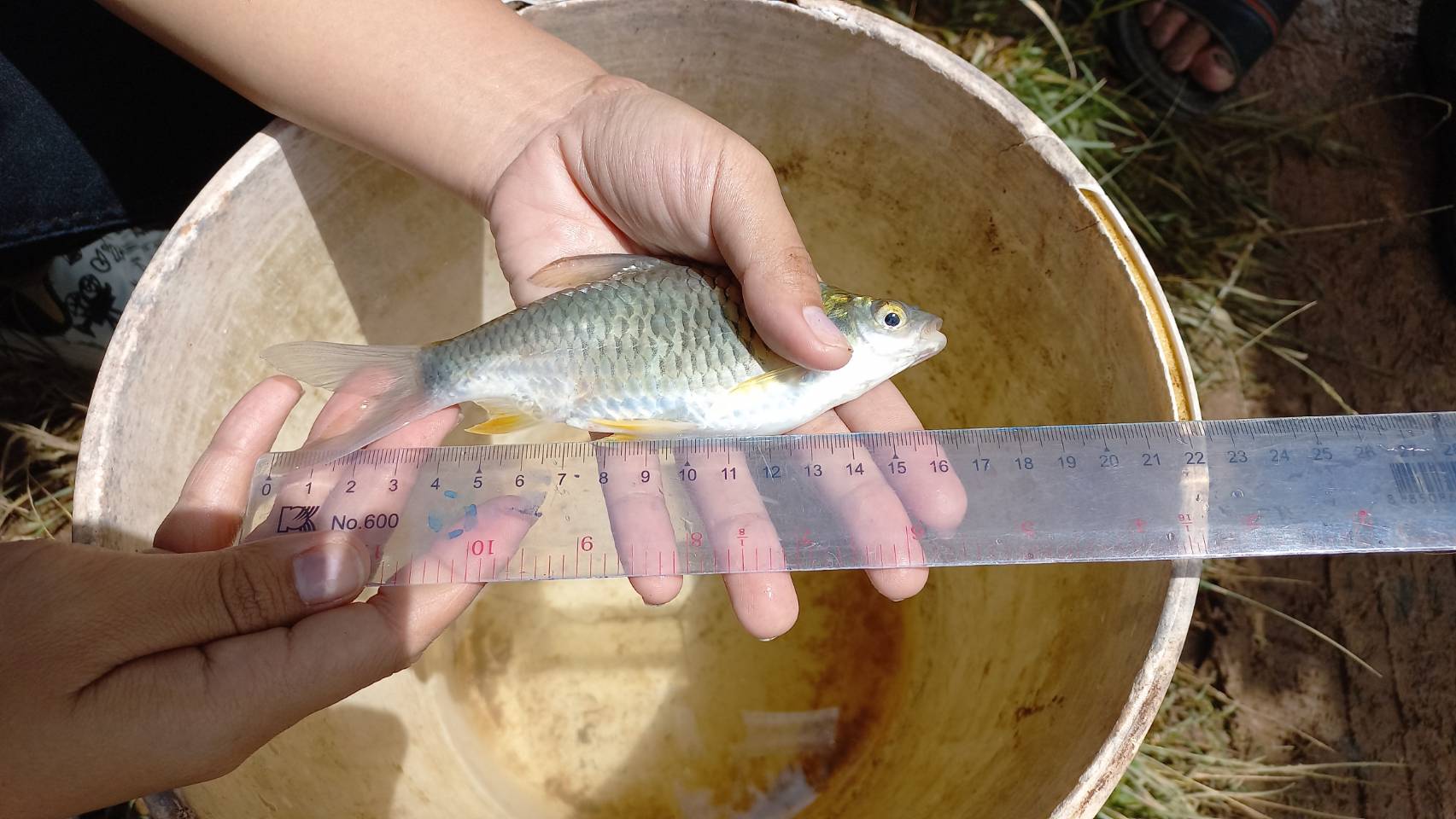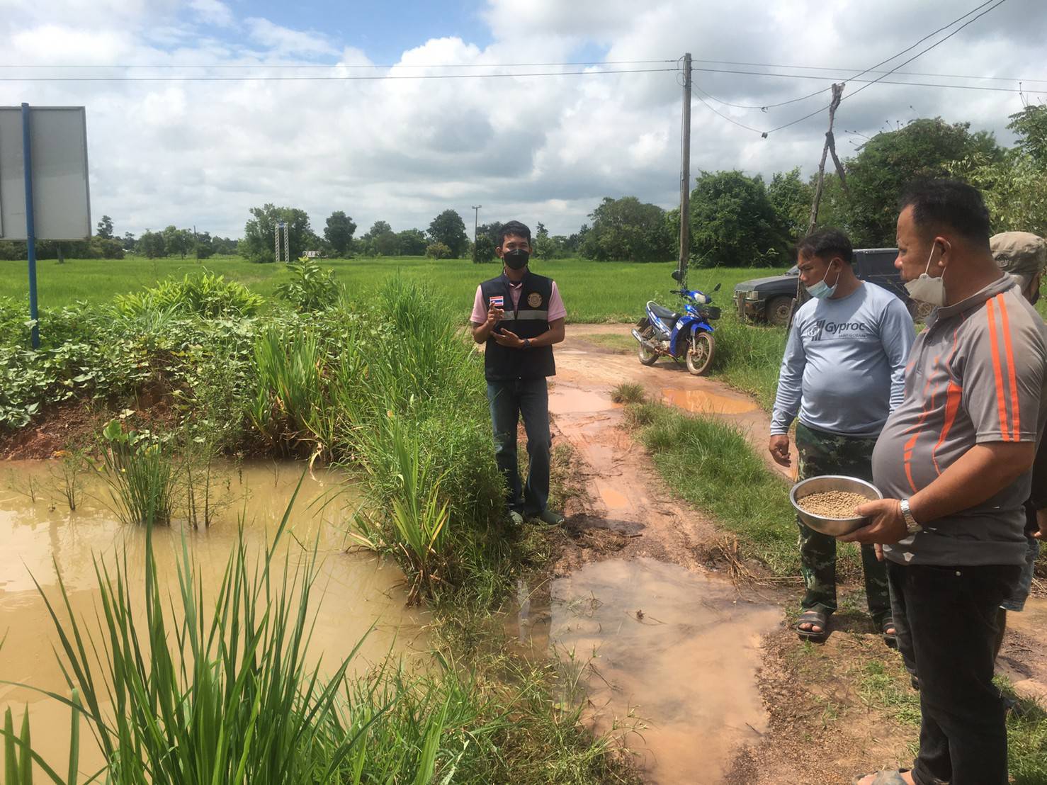 นายบัญชา ไกยสิทธิ์ นักวิชาการประมง พร้อมด้วยนางสาวเสาวภรณ์ ภูมิคำ เจ้าหน้าที่วิเคราะห์นโยบายและแผน สำนักงานประมงจังหวัดอุบลราชธานี ออกพื้นที่ติดตามผลการดำเนินงานโครงการส่งเสริมการเลี้ยงปลาในนาข้าวอินทรีย์ งบกลุ่มจังหวัดภาคตะวันออกเฉียงเหนือตอนล่าง 2 ปี 2564 ในพื้นที่บ้านดอนโพธิ์ ตำบลวาริน อำเภอศรีเมืองใหม่ จังหวัดอุบลราชธานี พบว่าปลาที่สนับสนุนมีขนาดความยาวที่ 10-17 เซนติเมตร และปลามีความแข็งแรงดี