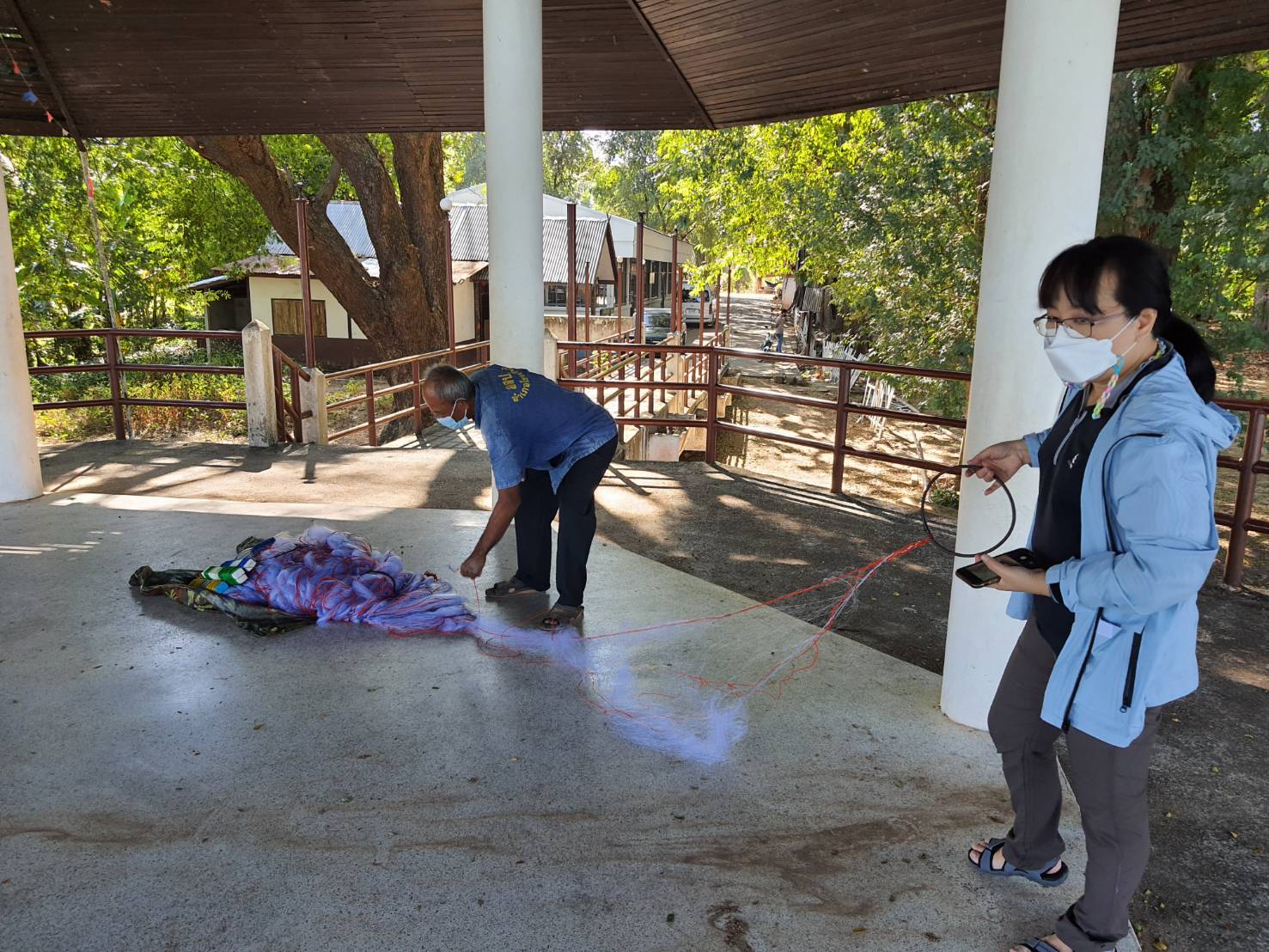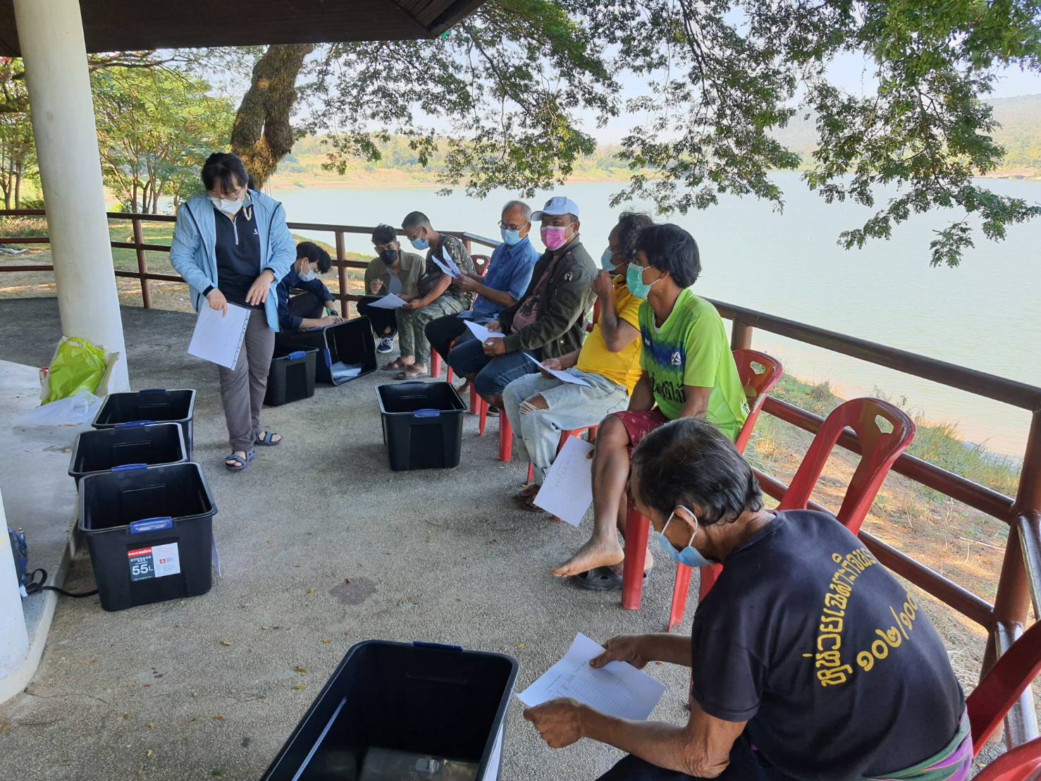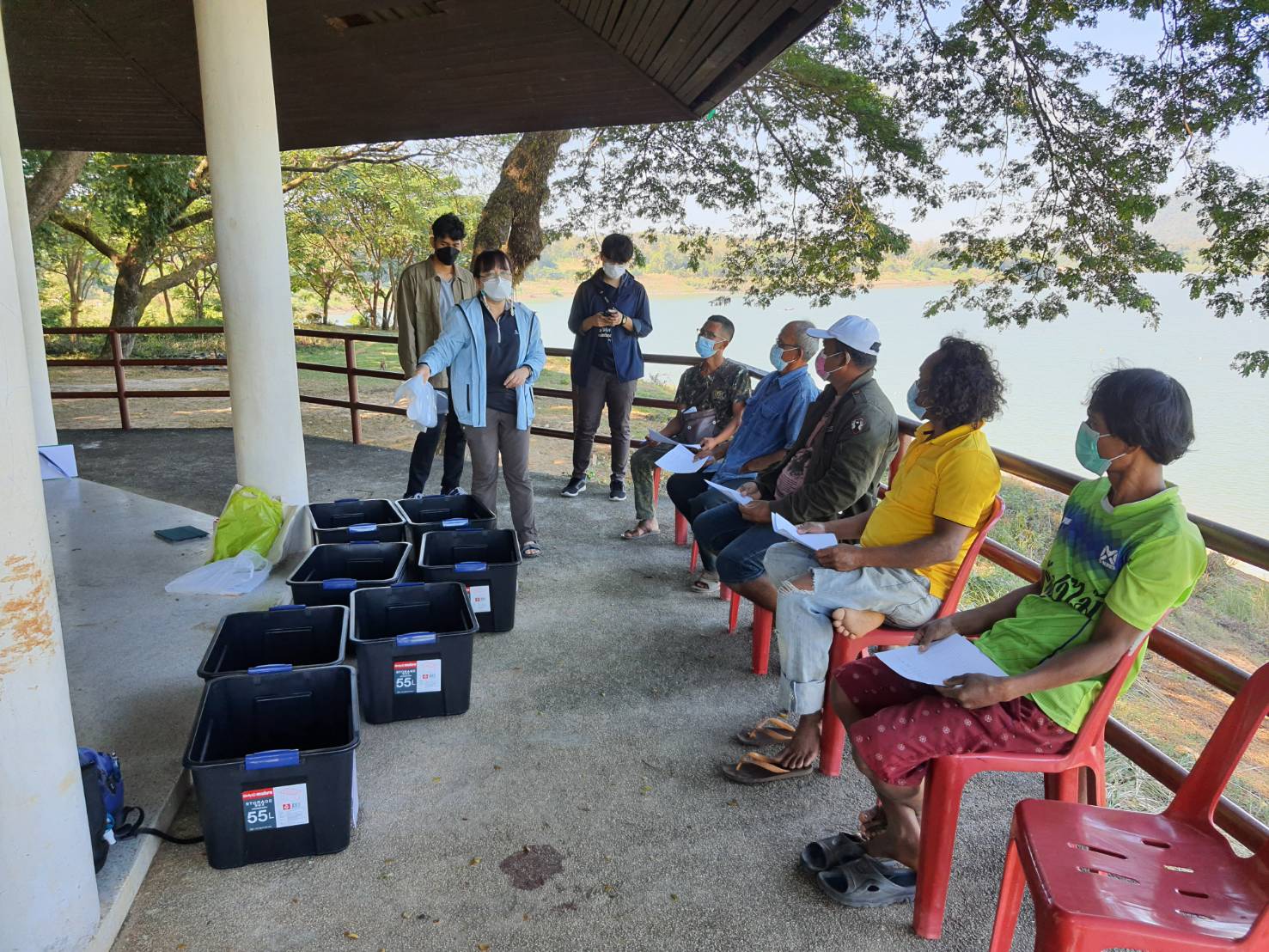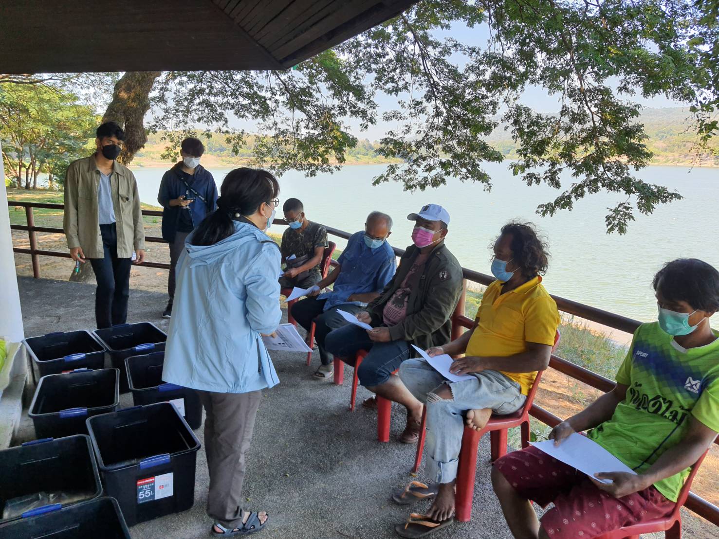 การลงพื้นที่บ้านเวินบึก ตำบลโขงเจียม อำเภอโขงเจียม จังหวัดอุบลราชธานี เพื่อพบกลุ่มชาวประมงและนำกล่องพลาสติกมาใส่ขยะที่ติดเครื่องมือประมงของชาวประมงในการทดลองงานวิจัยของมหาวิทยาลัยมหิดล