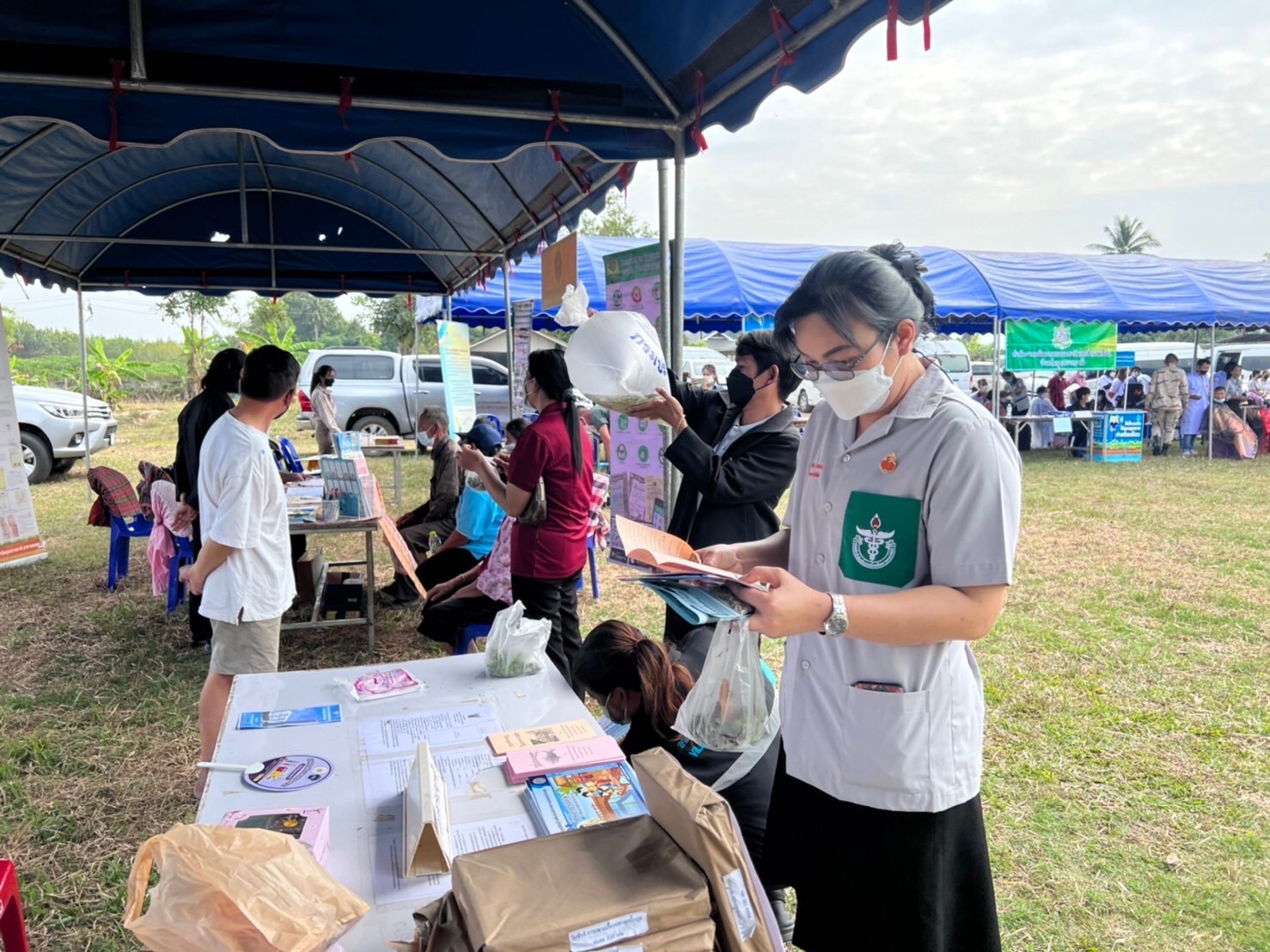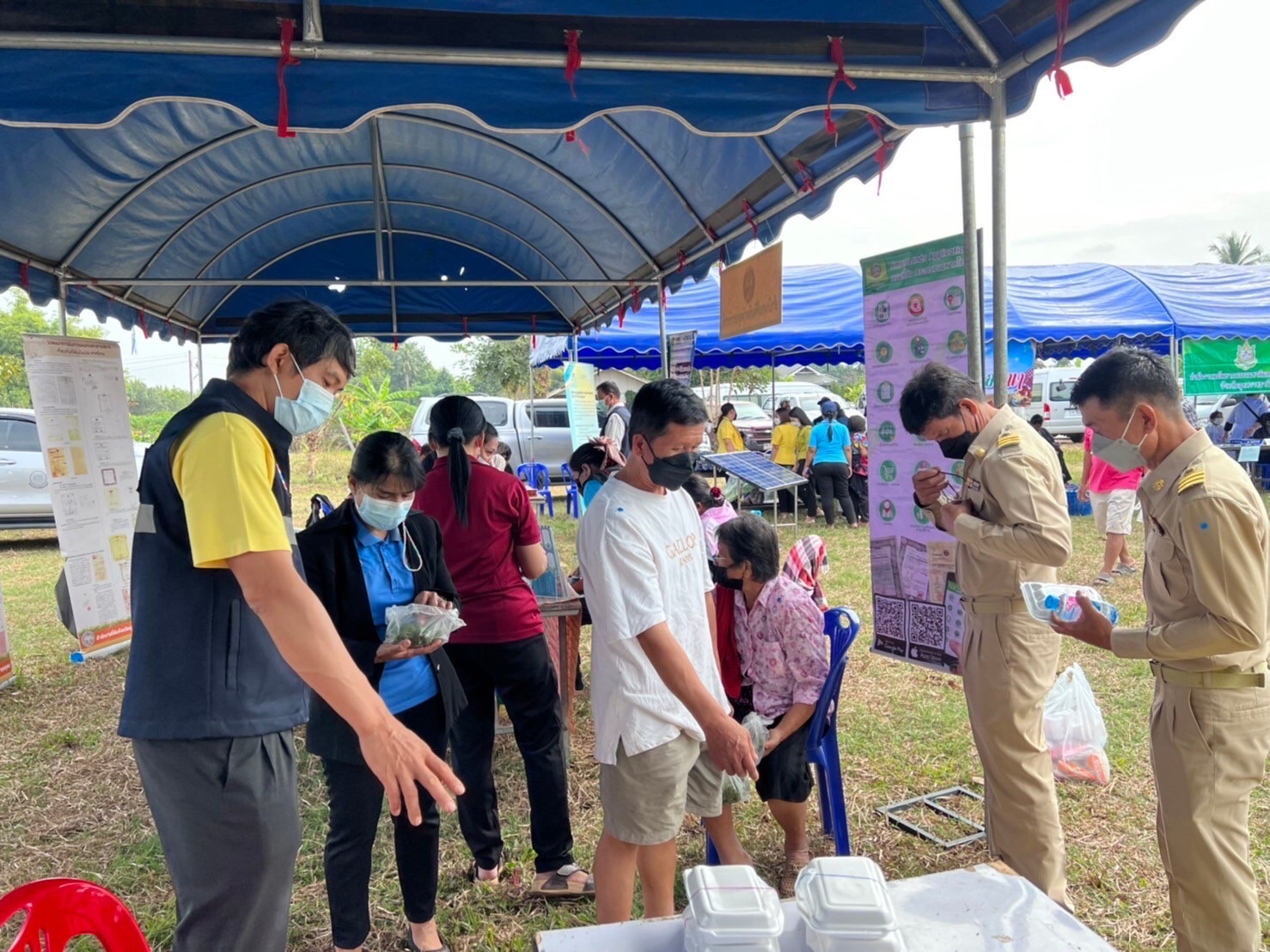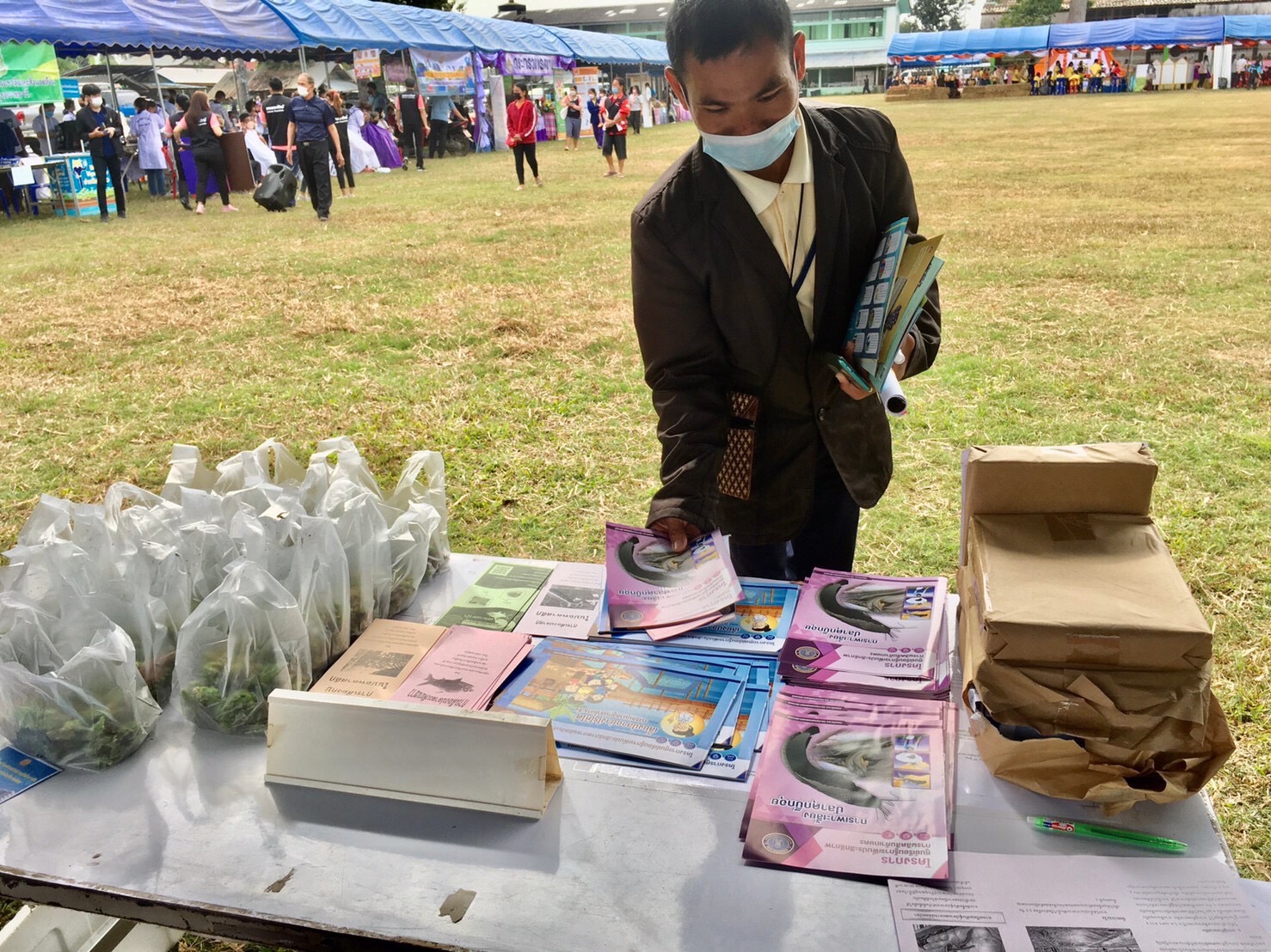 4. แจกแผ่นพับให้ข้อมูลด้านการเลี้ยงปลา กุ้งฝอย กบ และข้อมูลวิชาการด้านการประมง