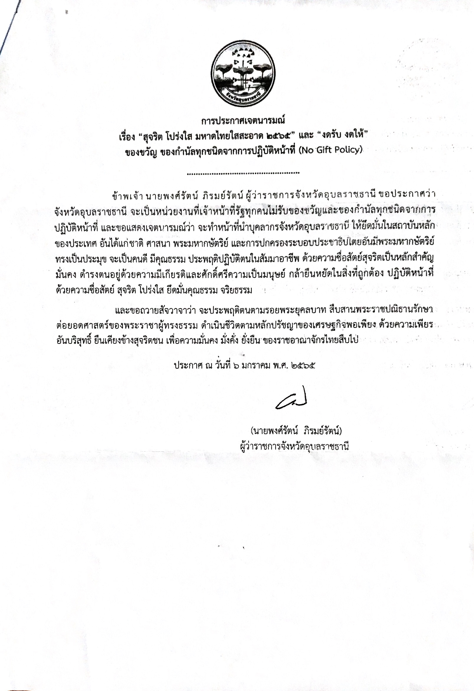 การประกาศเจตนารมณ์ "สุจริต โปร่งใส มหาดไทยใสสะอาด 2565 " และ "งดรับ งดให้" ของขวัญของกำนัล ทุกชนิดจากการปฏฺิบัติหน้าที่ (No Gift Policy)