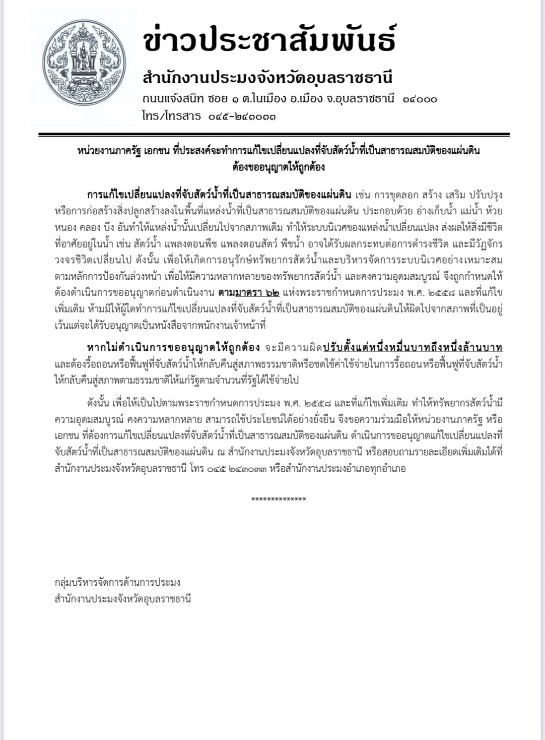 ข่าวประชาสัมพันธ์ ระเบียบกรมประมง เรื่อง การขออนุญาตทำการแก้ไขเปลี่ยนแปลงที่จับสัตว์น้ำที่เป็นสาธารณสมบัติของแผ่นดิน ให้ผิดไปจากสภาพที่เป็นอยู่