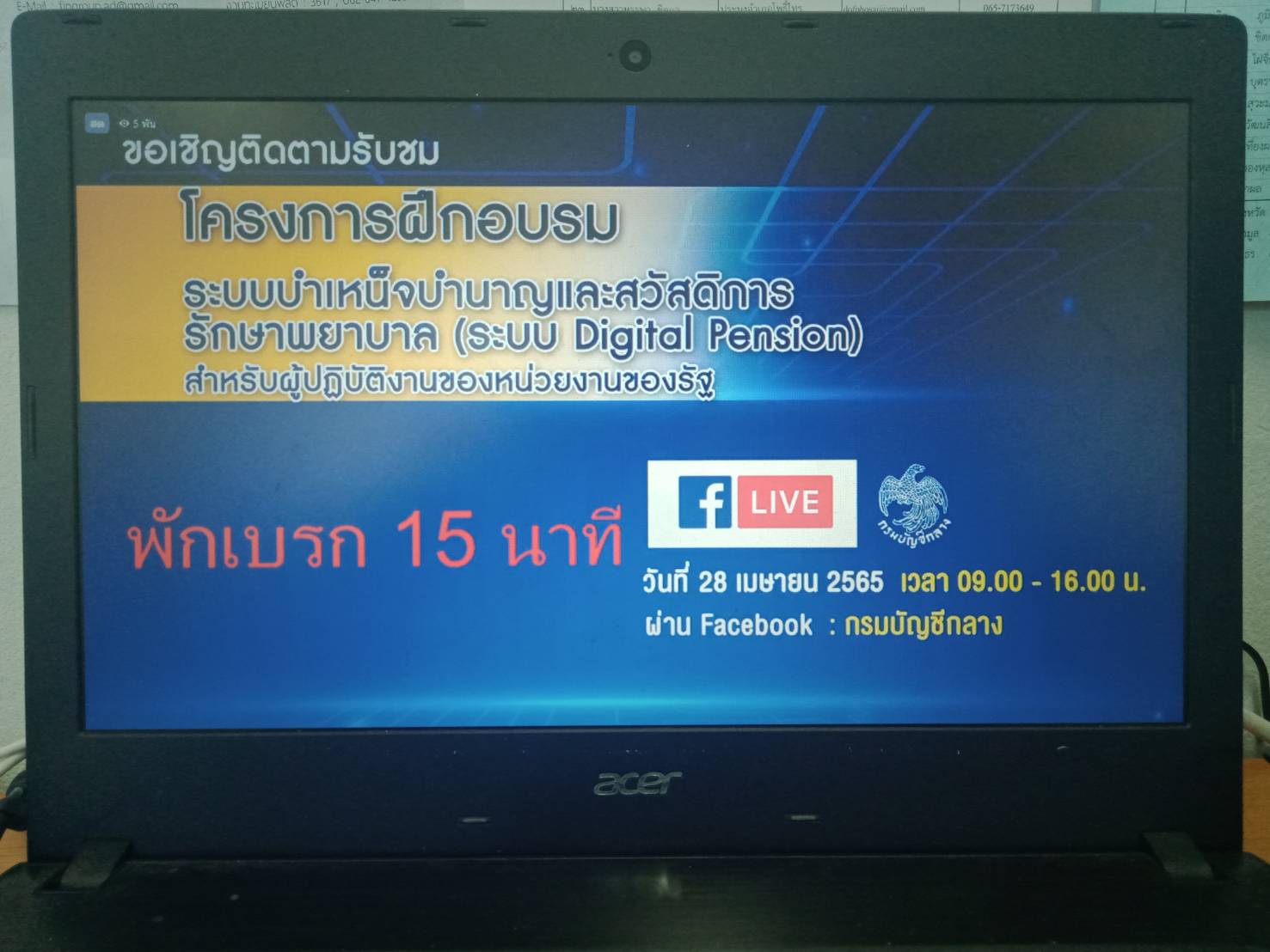 วันที่ 28 เมษายน 2565 เวลา 09.00-16.00 น. นางสาวจิณภัค ประจันต์ ตำแหน่งเจ้าพนักงานการเงินและบัญชีชำนาญงาน เข้าร่วมรับฟังโครงการฝึกอบรมระบบบำเหน็จบำนาญและสวัสดิการรักษาพยาบาล (ระบบ Digital Pension) สำหรับผู้ปฏิบัติงานของหน่วยงานของรัฐ ผ่านช่องทาง Facebook กรมบัญชีกลาง
