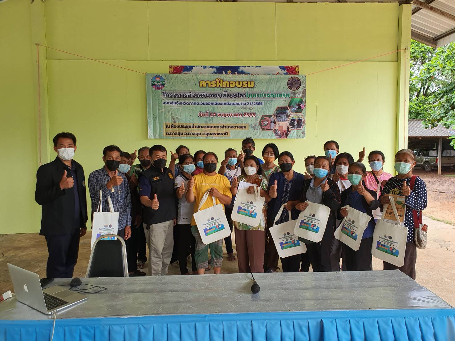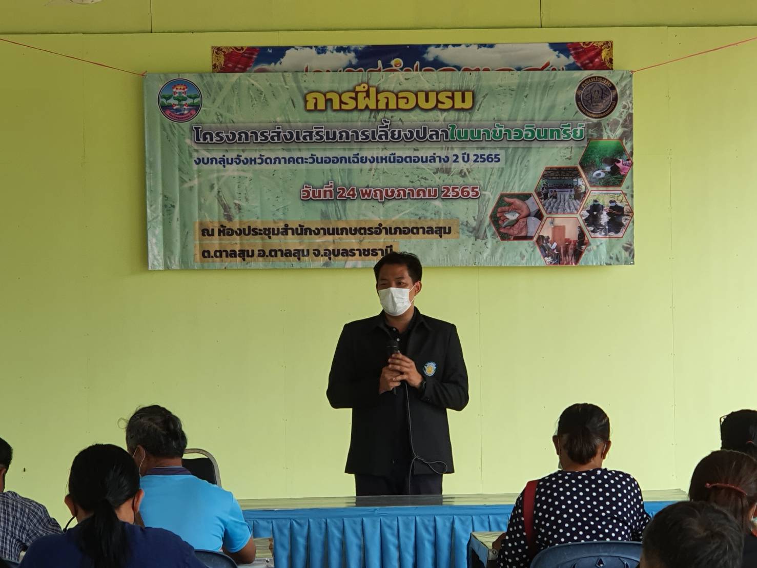 วันที่ 24 พฤษภาคม 2565 เวลา 08.00 น. นายประชุม ดวนใหญ่ หัวหน้ากลุ่มพัฒนาและส่งเสริมอาชีพการประมง มอบหมายให้ นายบัญชา ไกยสิทธิ์ นักวิชาการประมง พร้อมด้วยนายบัญญัติ ไฝ่จิต ประมงอำเภอพิบูลมังสาหาร จัดอบรมโครงการส่งเสริมการเลี้ยงปลาในนาข้าวอินทรีย์ งบกลุ่มจังหวัดภาคตะวันออกเฉียงเหนือตอนล่าง 2 ปี 2565  ณ สำนักงานเกษตรอำเภอตาลสุม อำเภอตาลสุม จังหวัดอุบลราชธานี โดยมีวิทยากรจากศูนย์วิจัยและพัฒนาประมงน้ำจืดอุบลราชธานี ถ่ายทอดความรู้เรื่องหลักการเลี้ยงปลาในนาข้าวอินทรีย์ และวิทยากรจากสำนักงานตรวจบัญชีสหกรณ์อุบลราชธานีถ่ายทอดความรู้เรื่องการจัดทำบัญชีรับจ่ายในครัวเรือน และต้นทุนการประกอบอาชีพ ให้แก่เกษตรกรที่เข้าร่วมโครงการฯจำนวน 20 ราย