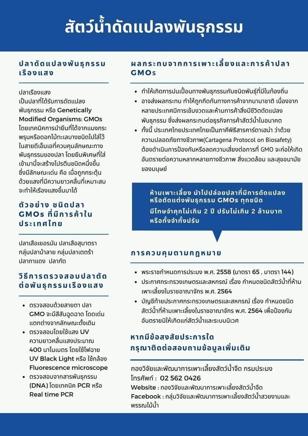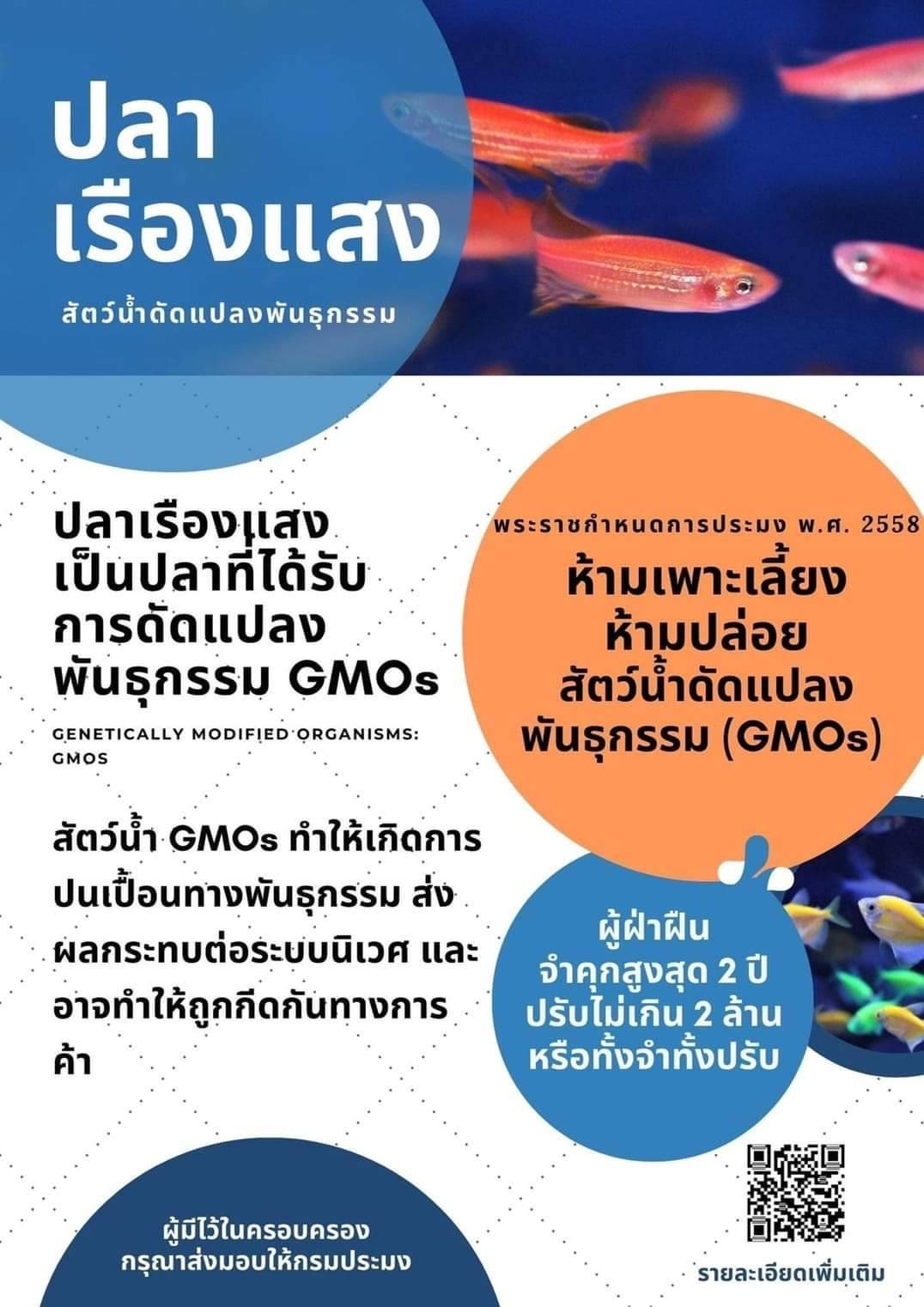 โดยกรมประมง มอบหมายสำนักงานประมงจังหวัด 77 จังหวัด ทั่วประเทศ ให้เร่งสร้างความรู้ความเข้าใจกับเกษตรกร และผู้ประกอบการ ถึงการเพาะเลี้ยงสัตว์น้ำที่มีการตัดต่อพันธุกรรม (สัตว์น้ำ GMOs) หรือ “ปลาเรืองแสง” หากมีไว้ในครอบครองให้ส่งให้กรมประมงได้ตั้งแต่ วันที่ 1 กันยายน - 30 พฤศจิกายน 2565 ณ ศูนย์วิจัยและพัฒนาการเพาะเลี้ยงสัตว์น้ำ กรมประมง ทั่วประเทศ หรือ สำนักงานประมงจังหวัดทั้ง 77 จังหวัดทั่วประเทศ