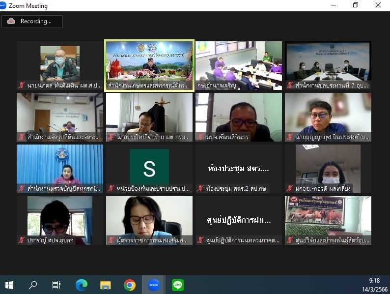 วันที่14 มีนาคม 2566 นายประชุม ดวนใหญ่ นักวิชาการประมงชำนาญการพิเศษ รักษาราชการแทนประมงจังหวัดอุบลราชธานี ประชุมตรวจติดตามความก้าวหน้าผลการดำเนินงานตามแผนการตรวจราชการ และการขับเคลื่อนแบบบูรณาการในพื้นที่ ของผู้ตรวจราชการกระทรวงเกษตรและสหกรณ์ ประจำปีงบประมาณ พ.ศ. 2566 รอบที่ 1 เขตตรวจราชการที่ 14 ณ ห้องประชุมยางนา สำนักงานเกษตรและสหกรณ์จังหวัดอุบลราชธานี โดยมีพันจ่าเอกประเสริฐ มาลัย ผู้ตรวจราชการกระทรวงเกษตรและสหกรณ์ เขต 14 เป็นประธาน