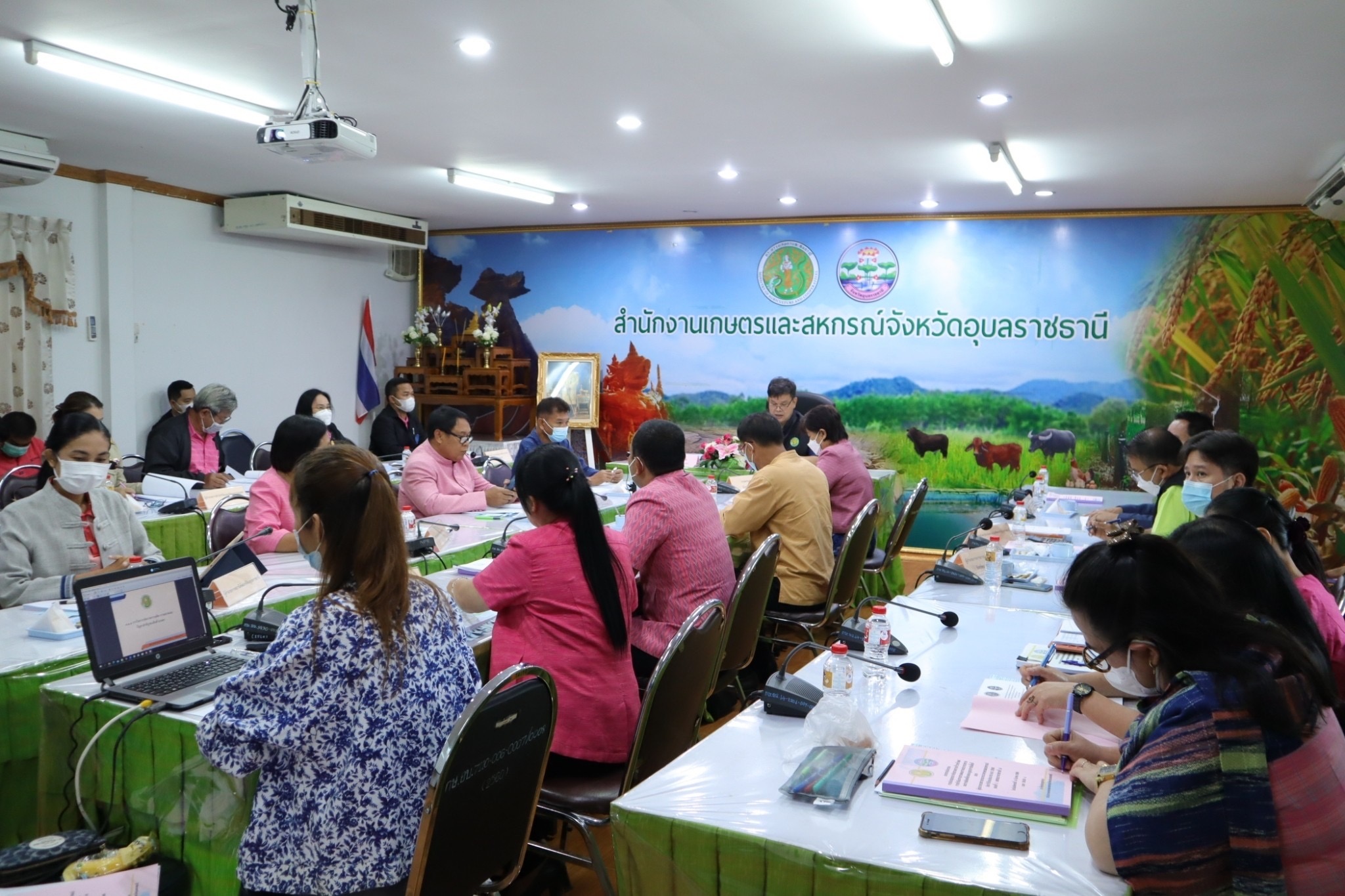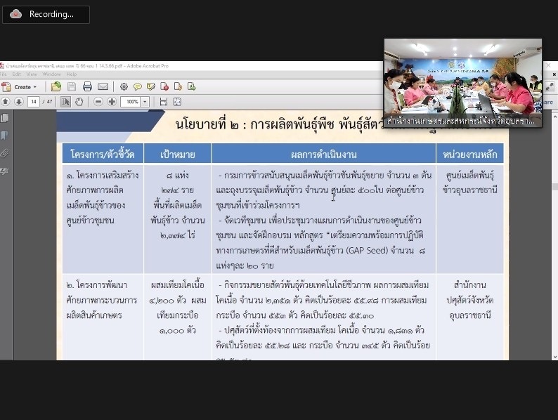 การครั้งนี้ที่ประชุมได้ชี้แจงผลการวิเคราะห์สินค้าเกษตรของจังหวัดอุบลราชธานี ด้านพืช ประมง และปศุสัตว์ และประเด็นการตรวจติดตามการตรวจราชการตามนโยบายสำคัญ ของกระทรวงเกษตรและสหกรณ์ พร้อมทั้งรับทราบรายงานผลการดำเนินงานขับเคลื่อนงานด้านการเกษตรแบบมุ่งเป้า ได้แก่ การผลิตปุ๋ยอินทรีย์คุณภาพสูง การผลิตปุ๋ยชีวภาพ การผลิตอาหารสัตว์ คุณภาพสูง ราคาถูก การผลิตอาหารสัตว์น้ำ และผลการดำเนินงานโครงการขับเคลื่อนการเกษตรระดับหมู่บ้านสู่การผลิตสินค้าเกษตรมูลค่าสูง จังหวัดอุบลราชธานี