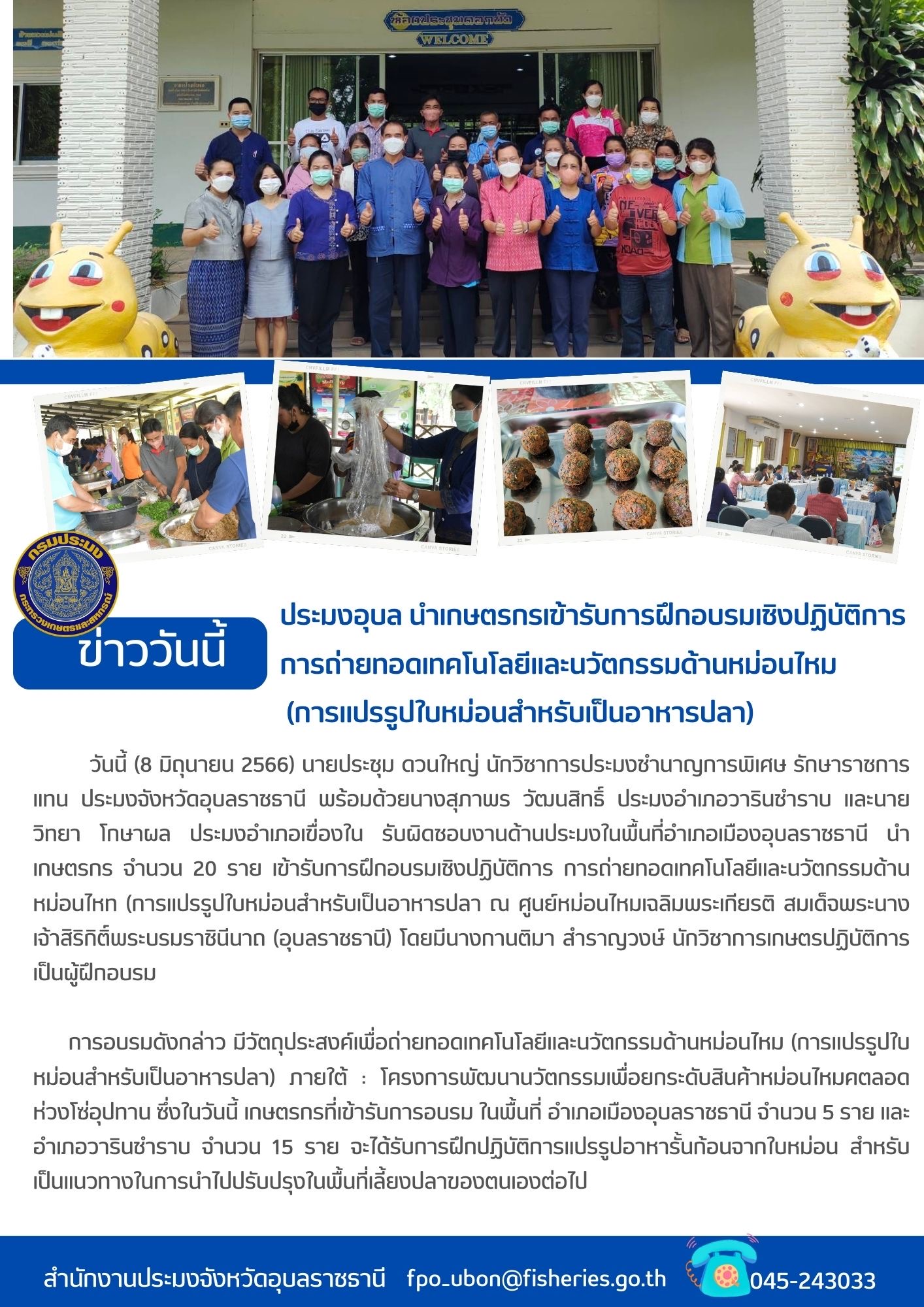 ซึ่งในวันนี้ เกษตรกรที่เข้ารับการอบรม ในพื้นที่ อำเภอเมืองอุบลราชธานี จำนวน 5 ราย และอำเภอวารินชำราบ จำนวน 15 ราย จะได้รับการฝึกปฏิบัติการแปรรูปอาหารั้นก้อนจากใบหม่อน สำหรับเป็นแนวทางในการนำไปปรับปรุงในพื้นที่เลี้ยงปลาของตนเองต่อไป