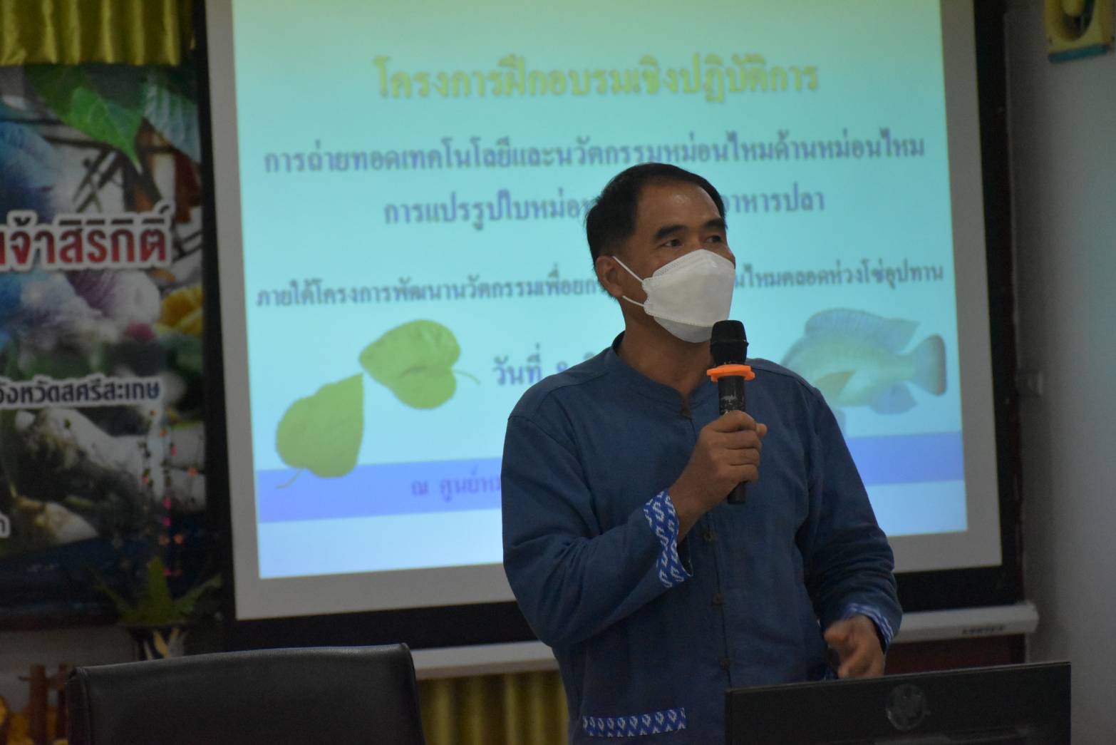 การอบรมดังกล่าว มีวัตถุประสงค์เพื่อถ่ายทอดเทคโนโลยีและนวัตกรรมด้านหม่อนไหม (การแปรรูปใบหม่อนสำหรับเป็นอาหารปลา) ภายใต้ : โครงการพัฒนานวัตกรรมเพื่อยกระดับสินค้าหม่อนไหมคตลอดห่วงโซ่อุปทาน