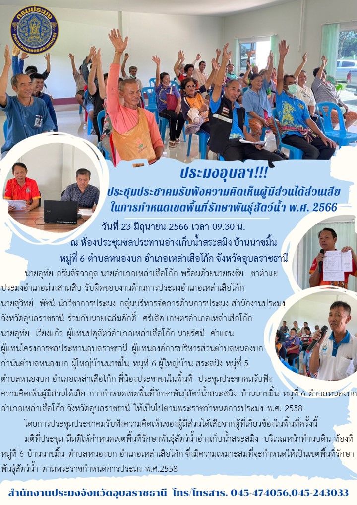 ประมงอุบลฯ!!!ประชุมประชาคมรับฟังความคิดเห็นผู้มีส่วนได้ส่วนเสีย ในการกำหนดเขตพื้นที่รักษาพันธุ์สัตว์น้ำ พ.ศ. 2566